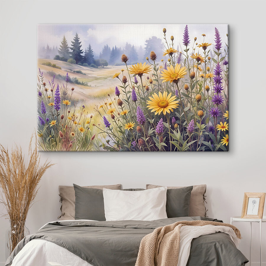 Transformeer je ruimte met de “Field of Flowers and Grass” canvas print, waarbij de natuur tot leven komt op je muur. Stel je voor dat je een dromerige weide binnenstapt, boordevol levendige gelen en rustgevende paarse tinten, terwijl een zacht briesje je zintuigen prikkelt. Dit stuk hangt er niet alleen, het nodigt warmte en vrolijkheid uit in je huis en geeft je het knusse gevoel dat je krijgt op zonovergoten dagen. Perfect voor een woonkamer of een sereen kantoor, het is alsof je een stukje buiten naar binnen haalt – zonder pollenallergie. Gewoon pure bloemenvreugde die je dag opvrolijkt!