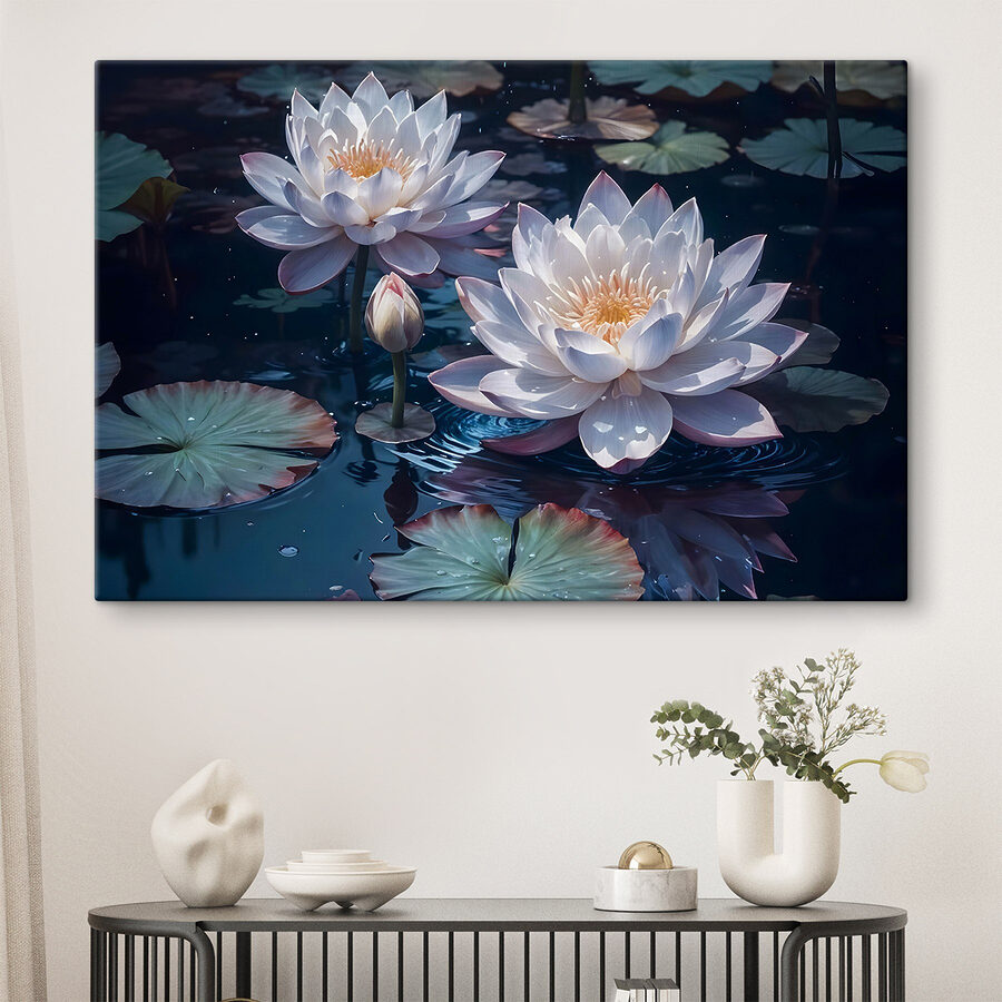 Tover elke kamer om in een serene oase met deze prachtige canvasprint, met een delicate groep witte bloemen die sierlijk in een vredige vijver drijven. Stel je voor dat je de ruimte binnenloopt en meteen een golf van rust over je heen voelt spoelen, als een mini-retraite zonder je huis te verlaten! De zachte kleuren en zachte reflecties nodigen uit tot dagdromen en rustige momenten. Of het nu een gezellig hoekje opfleurt of een vleugje elegantie toevoegt aan je woonkamer, dit stuk vertelt een verhaal van rust en schoonheid van de natuur. Het is alsof je een frisse wind tegen je muur hebt hangen! Perfect voor bloemenliefhebbers en kunstliefhebbers.