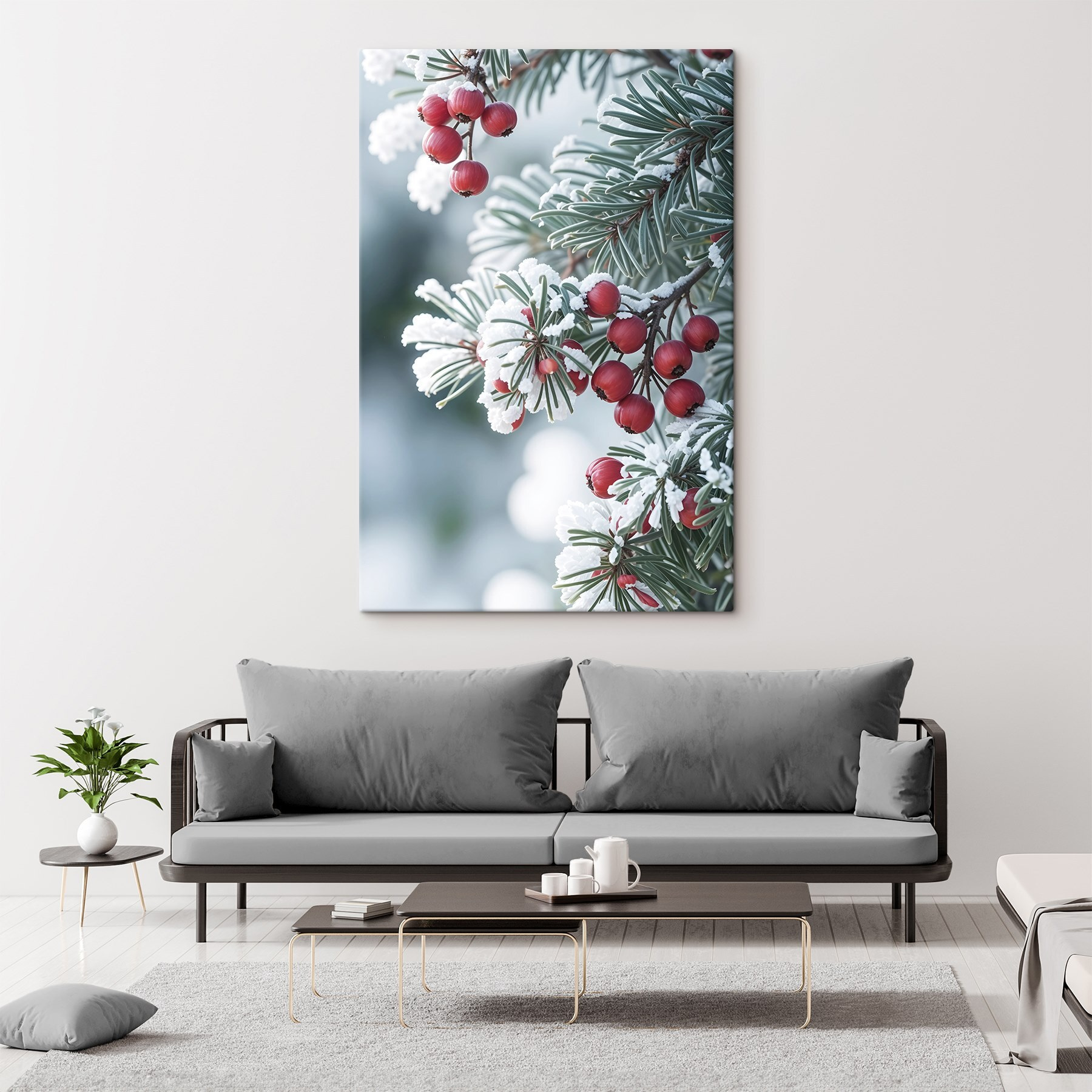 Of je nu chocolademelk drinkt bij het haardvuur of droomt van een besneeuwd landschap, dit canvas voegt precies het juiste vleugje charme en een vleugje elegantie uit de natuur toe. Het is niet zomaar kunst; het is een moment bevroren in de tijd, dat warmte en vreugde brengt aan elke muur. Perfect voor wie houdt van een beetje seizoensgevoel zonder de kou!