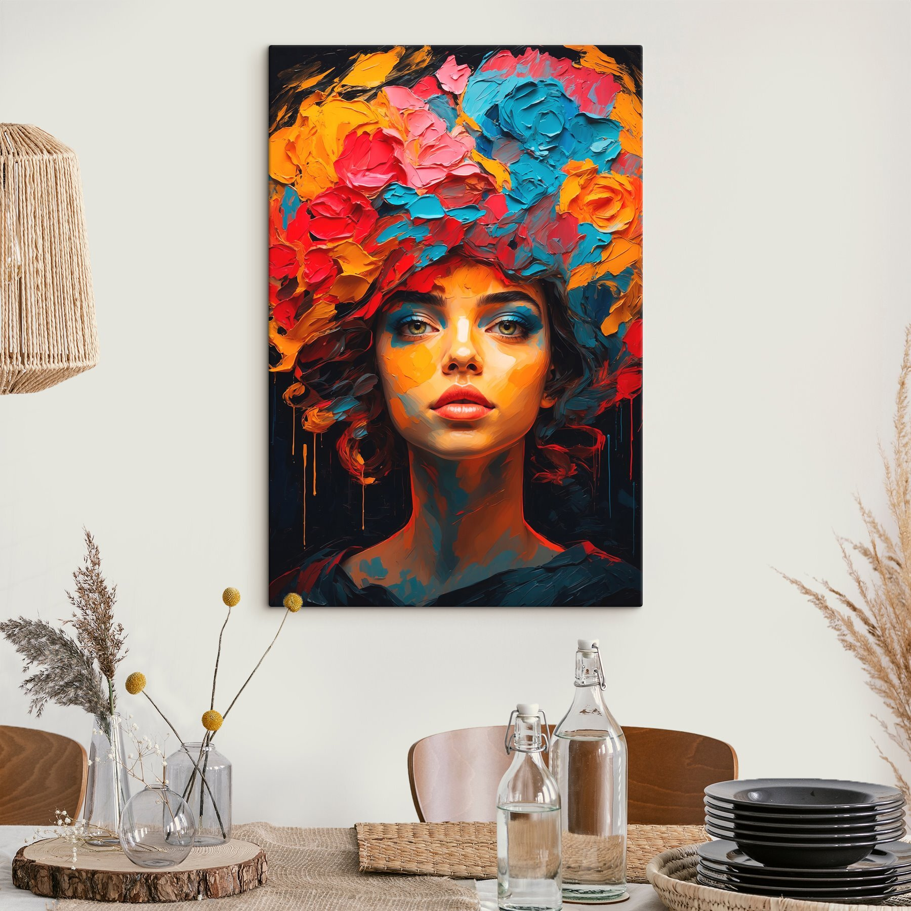 Deze heldere, gedurfde en o zo levendige canvasprint van een vrouw met een kroon van kleurrijke bloemen is meer dan alleen maar decor – het is een conversatiestarter. Stel je voor dat je een kamer binnenloopt en begroet wordt door dit prachtige stuk, waarvan de kleuren bijna van het doek afspringen! Het is alsof ze op het punt staat de geheimen van het universum prijs te geven – of in ieder geval met je te lachen. De diepe tinten contrasteren prachtig met haar serene uitdrukking, waardoor een perfecte balans ontstaat. Hang het op een plek waar je het dagelijks kunt zien en laat het je ruimte vullen met creativiteit en vreugde. Misschien inspireert het wel tot een dagdroom of twee!