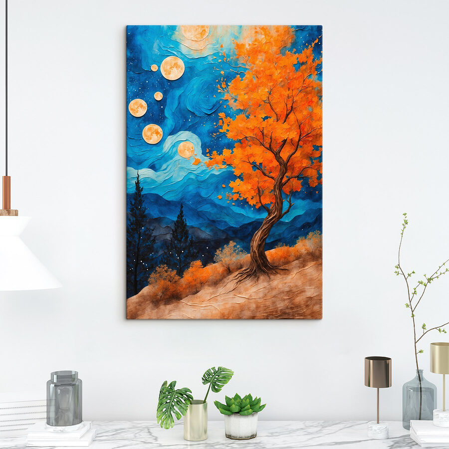 Transformeer je ruimte met deze prachtige canvasprint met een boom gehuld in vurige oranje bladeren, hoog oprijzend tegen majestueuze blauwe bergen. Het lijkt wel een verrassingsfeestje van de natuur zelf! De levendige kleuren knallen en zorgen voor een warme gloed die de stemming direct verbetert. Stel je voor dat je koffie drinkt onder dit kunstwerk, dat je de rust van het bos om je heen voelt of dat je je gedachten laat meevoeren met de bries. Perfect voor woonkamers of gezellige hoekjes, dit stuk is niet alleen decor, het is een stukje sereniteit dat je aan je muur kunt hangen. Wie zou dat niet willen?