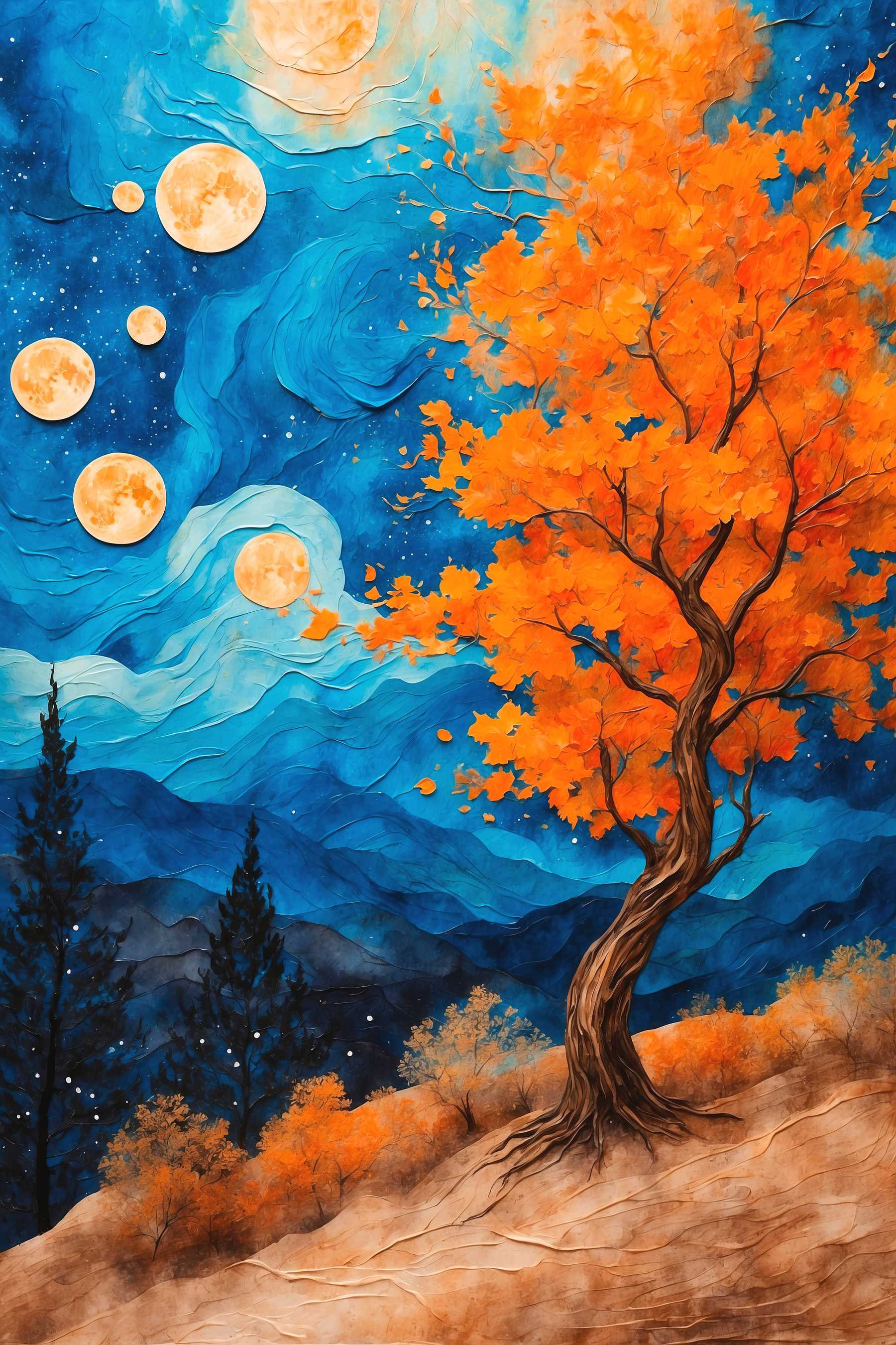 Transformeer je ruimte met deze prachtige canvasprint met een boom gehuld in vurige oranje bladeren, hoog oprijzend tegen majestueuze blauwe bergen. Het lijkt wel een verrassingsfeestje van de natuur zelf! De levendige kleuren knallen en zorgen voor een warme gloed die de stemming direct verbetert. Stel je voor dat je koffie drinkt onder dit kunstwerk, dat je de rust van het bos om je heen voelt of dat je je gedachten laat meevoeren met de bries. Perfect voor woonkamers of gezellige hoekjes, dit stuk is niet alleen decor, het is een stukje sereniteit dat je aan je muur kunt hangen. Wie zou dat niet willen?