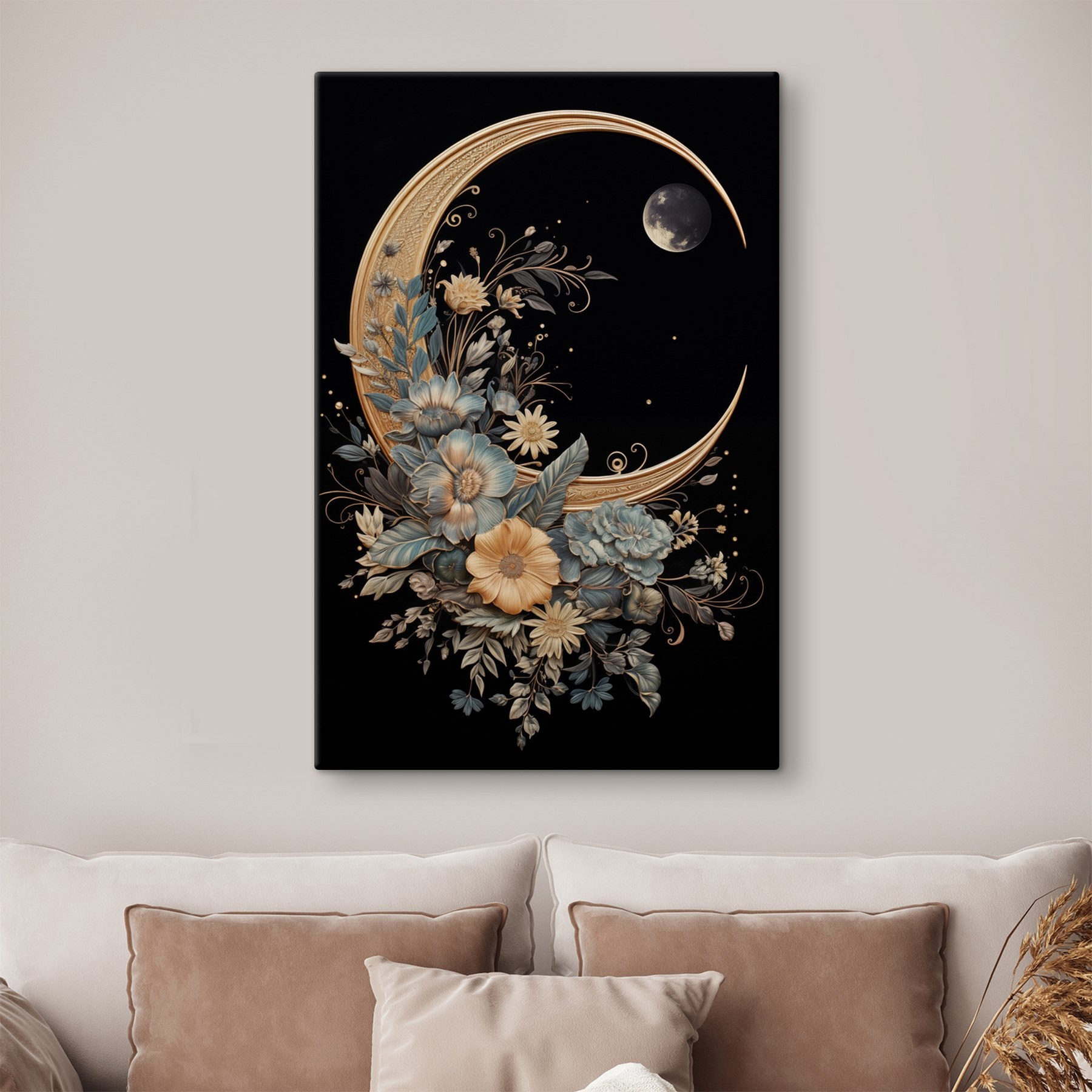 Transformeer elke kamer met deze prachtige canvasprint met een maan omringd door betoverende bloemen en bladeren. Het is als een botanische droom rechtstreeks uit een grillig verhalenboek! Stel je deze schoonheid voor aan je muur, die uitnodigt tot warmte en rust. De gedempte kleuren creëren een balans die zowel levendig als rustgevend aanvoelt. Misschien vragen je vrienden wel of je ergens een geheime tuin hebt. Perfect voor een gezellig hoekje of een uitnodigende entree, dit stuk voegt een vleugje magie van de natuur toe, waardoor elke blik een kleine herinnering is om even stil te staan en adem te halen. Wie zou dat niet willen?