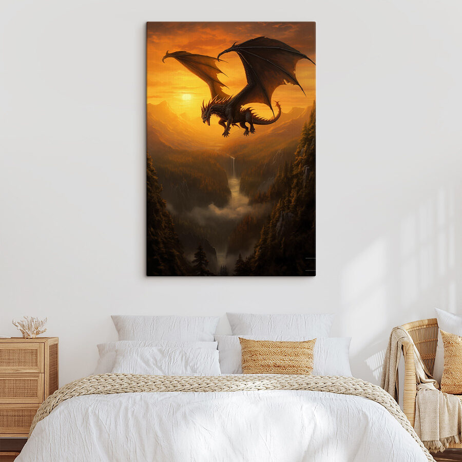 Breng een vleugje avontuur in je interieur met deze prachtige canvasprint, “Dragon Flying Over a Valley”. Stel je dit voor: een majestueuze draak zweeft door een vurige zonsondergang, de vleugels wijd uitgespreid alsof hij je uitnodigt om mee te gaan op zijn mystieke reis. De levendige kleuren en het dramatische landschap creëren een gevoel van verwondering, waardoor elke blik aanvoelt als een mini-ontsnapping. Dit kunstwerk is perfect voor een woonkamer of een gezellig leeshoekje en stimuleert gesprekken en verbeelding. Het is het soort kunstwerk dat je meeneemt naar een andere wereld en misschien zelfs een verhaal of twee losmaakt. Wie wil er nou niet een beetje magie aan de muur hebben hangen?