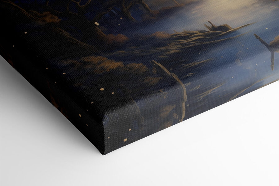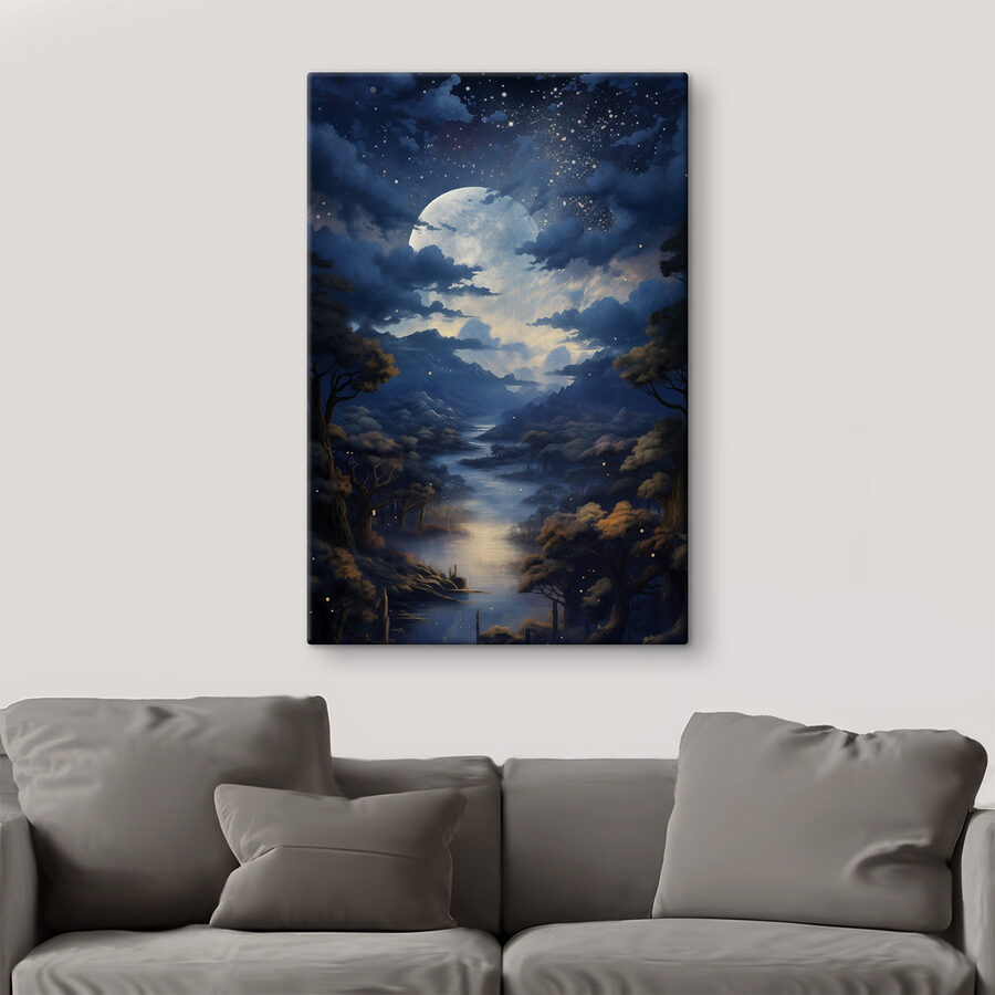 Stel je een serene avond voor, de maan die haar zachte gloed over een rustige rivier werpt. Deze canvasprint, “Moon over a River”, brengt dat vredige tafereel bij je thuis. Met zachte blauwtinten en rustgevende schaduwen nodigt het uit tot ontspanning, waardoor het perfect is voor een gezellige leeshoek of die lege muur die al een tijdje smeekt om wat liefde. Stel je voor dat je lekker wegkruipt met een kopje thee, terwijl de zachte tinten je omringen als een koele bries. Het is als een kleine ontsnapping naar de natuur zonder je plek te verlaten – wie zou dat niet willen? Plus, het is een geweldige gespreksstarter. Maak je klaar voor complimentjes over deze prachtexemplaar!