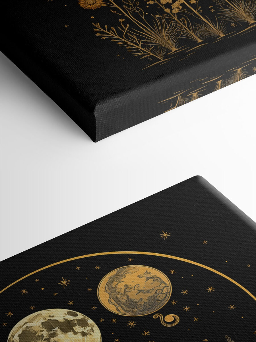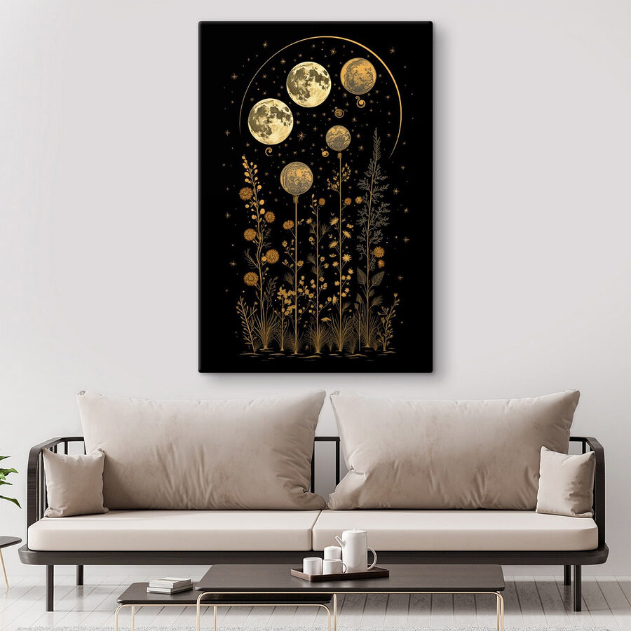 Transformeer elke ruimte met deze betoverende canvasprint met de betoverende dans van maanfasen tegen een diepzwarte achtergrond. Het is alsof je een stukje van de nachtelijke hemel in je woonkamer hebt. Stel je voor dat je lekker wegkruipt met een goed boek, terwijl de zachte gloed van deze hemellichamen een dromerige sfeer toevoegt aan je knusse hoekje. De delicate bloementoetsen vormen de grond van de manen en zorgen voor een perfecte balans die levendig en toch rustgevend aanvoelt. Dit kunstwerk wekt nieuwsgierigheid op en prikkelt de verbeelding – perfect voor mensen die houden van de wonderen der natuur en een vleugje mysterie. Of het nu in een slaapkamer, studeerkamer of de favoriete hangplek van al je vrienden staat, dit kunstwerk nodigt uit tot een gesprek. Zie hoe gasten verdwalen in de ingewikkelde details en nadenken over alles van de kosmos tot een tuin om middernacht. Een vleugje eigenzinnigheid, een vleugje natuur en een heleboel charme – wat is er niet leuk aan?