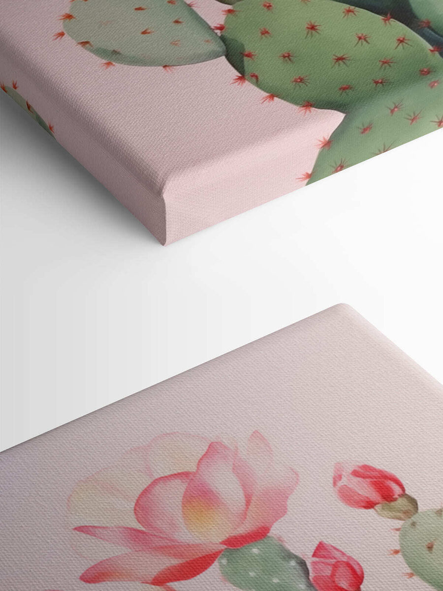 Transformeer je kamer met deze prachtige canvasprint, met een levendige cactus versierd met bloeiende bloemen. Het is alsof je een stukje woestijn naar je woonkamer brengt – zonder de stekels! De zachte roze en groene tinten creëren een feelgood vibe, perfect om elk hoekje op te fleuren. Stel je voor dat je ‘s ochtends aan je koffie nipt en je koestert in de warmte van dit vrolijke kunstwerk. Het heeft die mooie mix van natuur en charme, plus het is een geweldige gespreksstarter – wie wist dat cactussen er zo fantastisch uit konden zien? Voeg een vleugje natuurschoon toe aan je collectie!