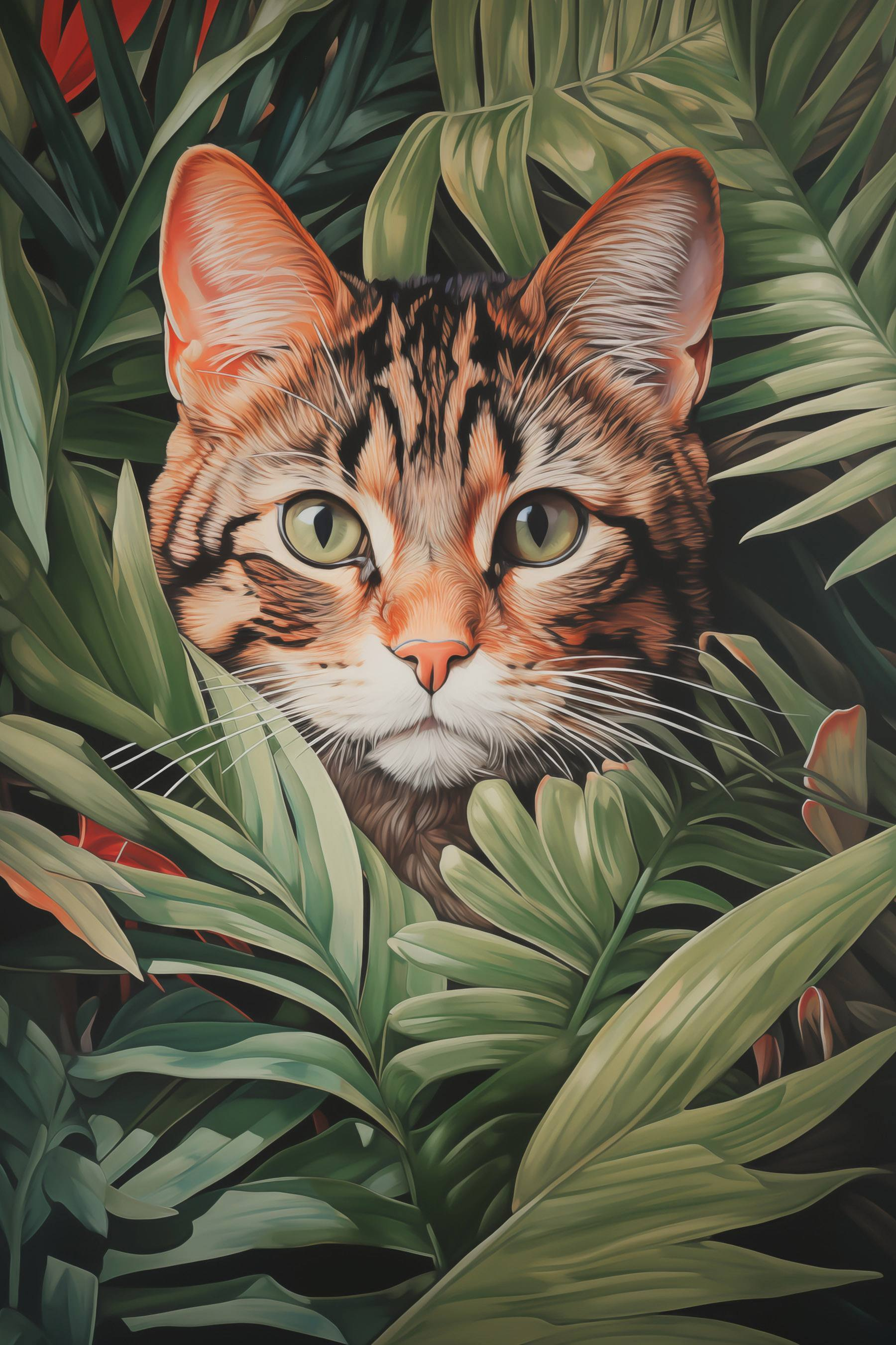 Tover elke kamer om in een levendige jungle met deze betoverende “Cat in a Jungle” canvasprint. Stel je voor: een nieuwsgierige katachtige die door de levendige bladeren gluurt, met zijn brede ogen vol ondeugendheid en verwondering. Het is alsof je een stukje natuur in je woonkamer hebt, die je verhalen van avontuur en rust influistert. Dit kunstwerk nodigt uit tot glimlachen en stimuleert gesprekken, perfect voor iedereen die van dieren houdt of gewoon hunkert naar een vleugje natuur. Hang het in je kamer en het voelt ineens als een gezellig hoekje waar elke blik een vleugje vreugde brengt. Pas maar op: deze kleine ontdekkingsreiziger kan je aanzetten tot serieus dagdromen!