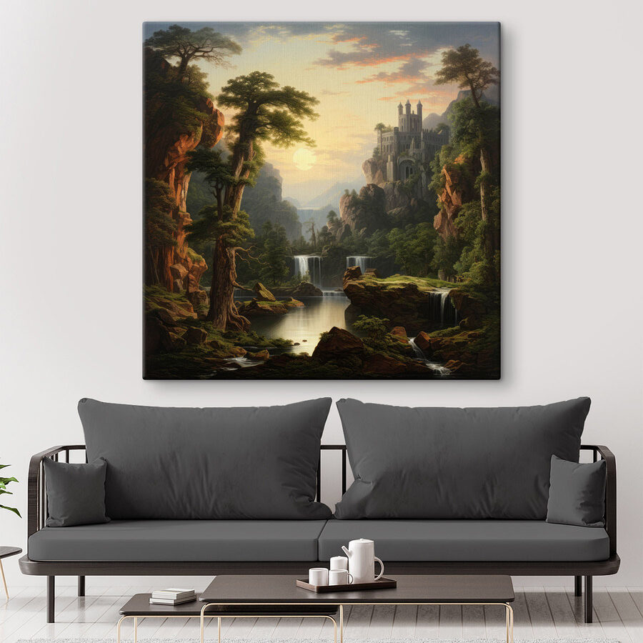 Transformeer je kamer met deze betoverende canvasprint met een serene waterval en een majestueus kasteel in de bergen. Het is net alsof je een stukje sprookjesachtige charme in je woonkamer brengt – zonder de draken natuurlijk! Stel je voor dat je tot rust komt in een knusse stoel, met een warm kopje thee in de hand, terwijl het zachte geluid van klaterend water de lucht vult. Het levendige groen en de warme tinten van de zonsondergang kunnen zelfs de grijsste dag een beetje vrolijker maken. Het is perfect voor wie droomt van weelderige bossen en ontsnappingen naar de bergen, om een vleugje natuurschoon in huis te halen. Wie wil er nu niet elke dag naar een stukje avontuur staren? Ontketen je innerlijke ontdekkingsreiziger terwijl je het comfort van thuis behoudt.