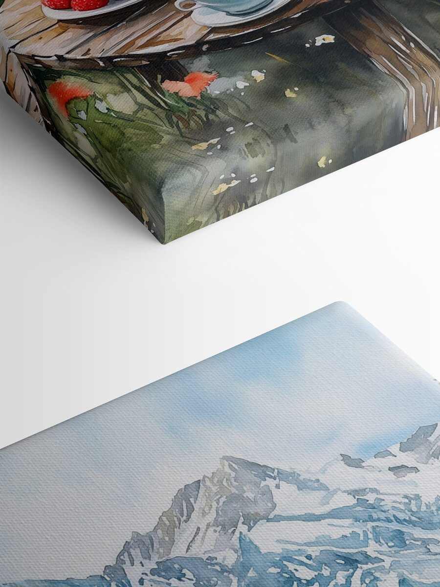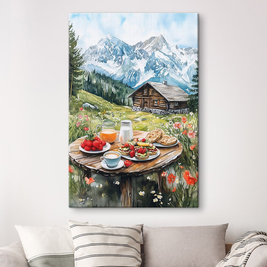 Transformeer elke ruimte met deze prachtige canvasprint met een serene tafel gedekt met heerlijke hapjes en verse drankjes tegen een adembenemende achtergrond van bergen. Stel je de zon voor die door de bomen schijnt, de geur van wilde bloemen die zich vermengt met het aroma van koffie. Het is alsof je een klein stukje paradijs in huis haalt. Dit meubel is perfect voor keukens of eetkamers en straalt vrolijkheid uit. Misschien inspireert het zelfs wel tot brunchbijeenkomsten of luie ochtenden met een kopje thee. Wie zou geen gevoel van rust en warmte krijgen als hij naar dit schilderachtige tafereel kijkt? Het gaat allemaal om die gezellige sfeer!