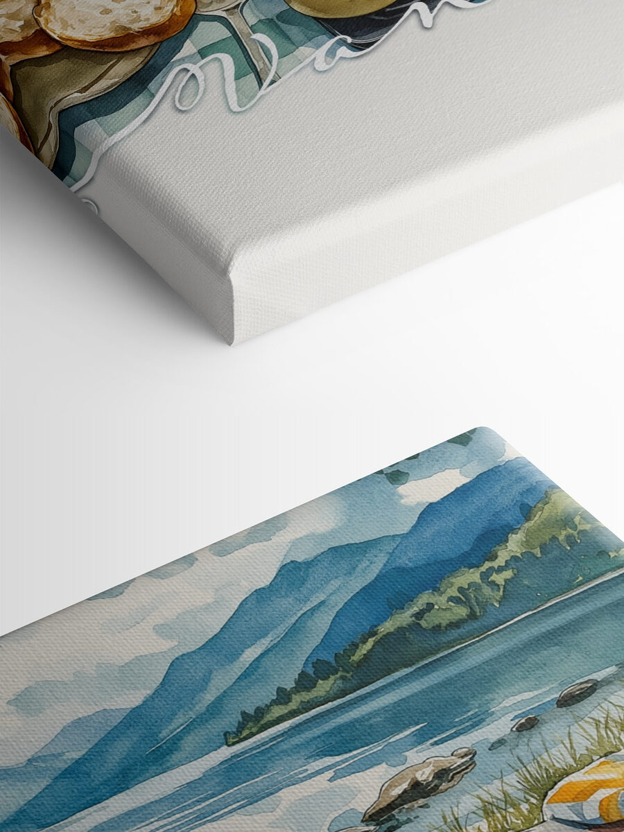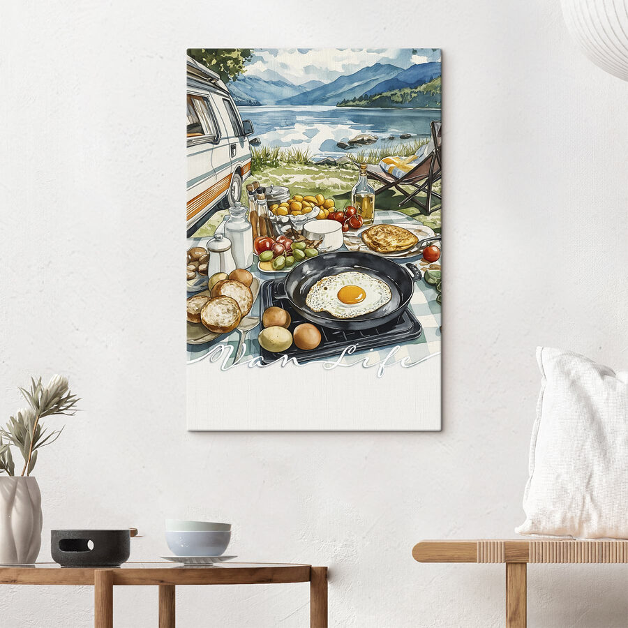 Creëer de sfeer voor je ruimte met deze canvasprint, “Canvasprints Tafel met eten en een pan erop”. Stel je een schilderachtige ochtend bij het meer voor, met een gezellig busje en een verrukkelijk broodbeleg voor je klaargezet. Stel je de geur voor van verse eieren die knisperen in de pan, fruit dat glinstert in het zonlicht en het zachte kabbelen van het water vlakbij. Het is als een uitnodiging om het wat rustiger aan te doen en te genieten van de kleine dingen in het leven. Dit kunstwerk fleurt niet alleen een muur op, het wekt vreugde, nostalgie en misschien zelfs zin in een weekendje weg. Dit levendige kunstwerk is perfect voor elke foodie of avonturier en voegt warmte, eigenzinnigheid en een vleugje reislust toe aan elke kamer.