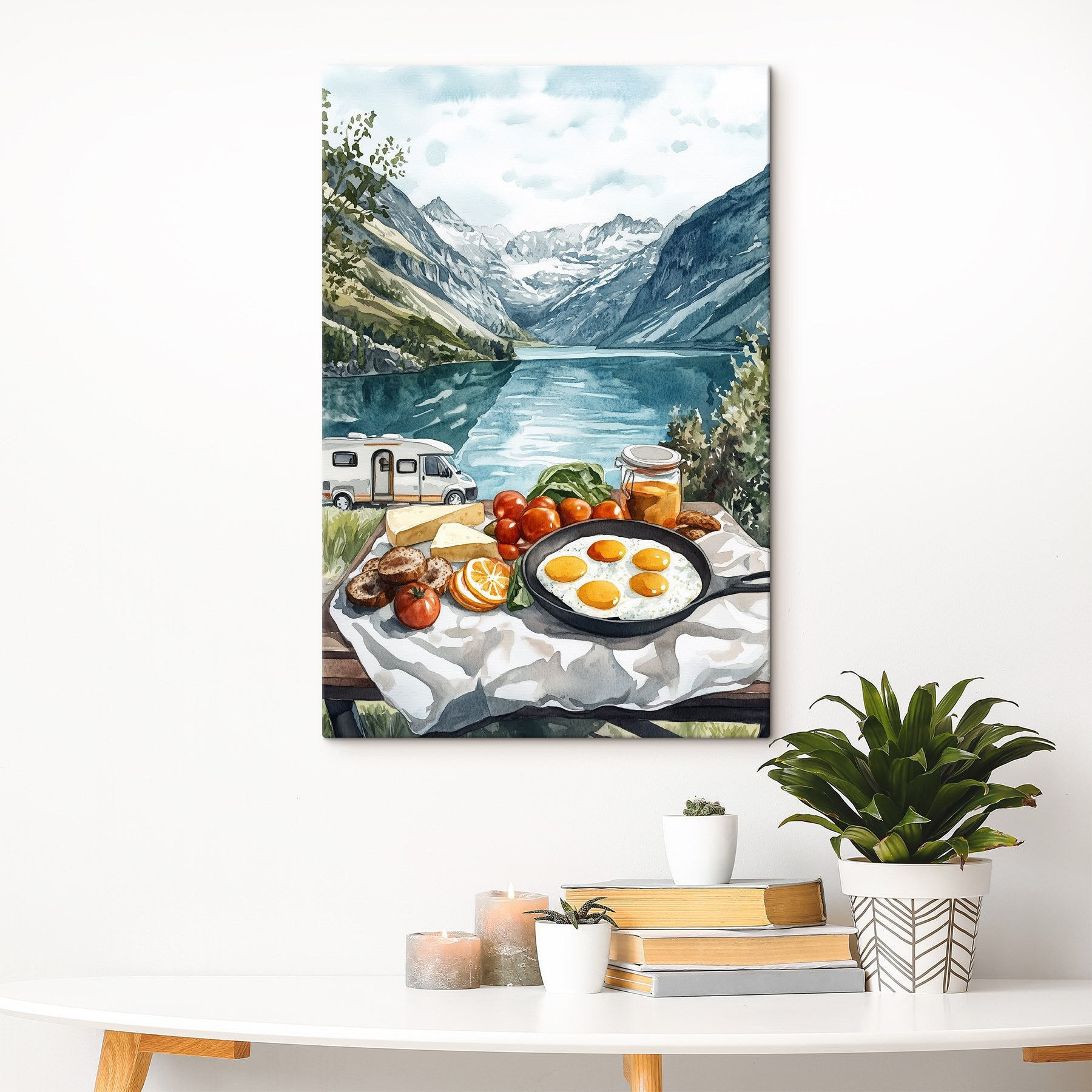 Transformeer je ruimte met deze prachtige canvasprint, “Eten op een tafel naast een meer”. Stel je de geur voor van verse eieren die sissen in de ochtendzon, met een schilderachtig meer als achtergrond. Het is net een mini-uitstapje aan je muur! De aquarelstijl brengt warmte en sereniteit, perfect voor gezellige momenten of levendige bijeenkomsten. Stel je vrienden voor die samen lachen en snacks eten, terwijl de schoonheid van de natuur hen omringt. Dit kunstwerk is een vriendelijke herinnering om te genieten van de eenvoudige genoegens van het leven. Wie wil daar nou niet van genieten?