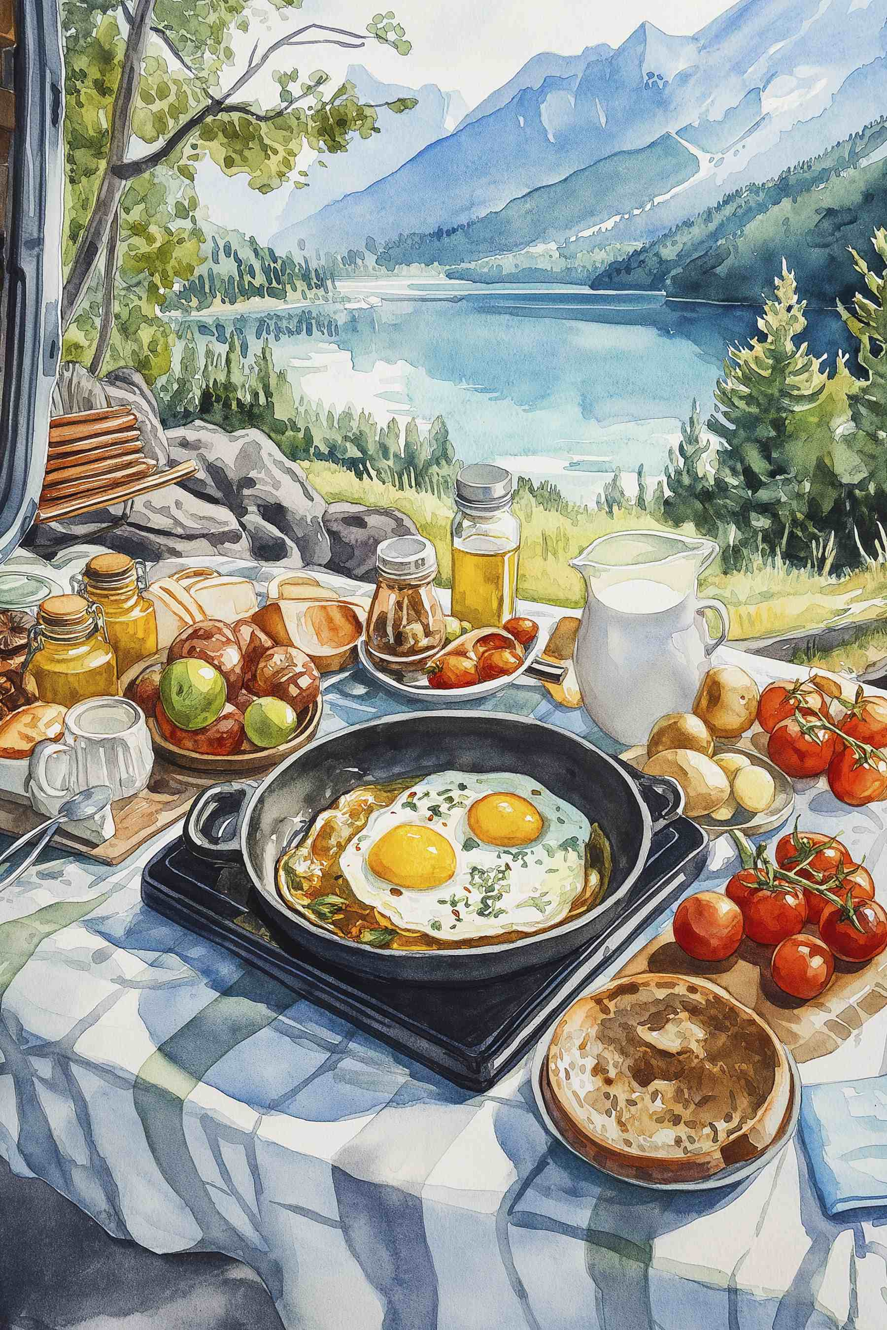 Stel je voor: een gezellige ochtend aan het meer, de zon die door de bomen schijnt terwijl er een heerlijk ontbijt op je staat te wachten. Deze canvasprint legt dat magische moment vast – een heerlijk ontbijt met eieren, verse tomaten en smakelijk gebak, omlijst door een prachtig uitzicht op de bergen. Perfect voor wie van eten en natuur houdt, of gewoon zijn muur wil opfleuren met een beetje smaak. Het is alsof je een stukje sereniteit van het buitenleven in huis haalt. Hang het in de keuken of eethoek en voel de warme sfeer elke dag over je heen komen. Wie wil er nu geen dagelijkse herinnering aan zonnige ontbijtjes en goede tijden?