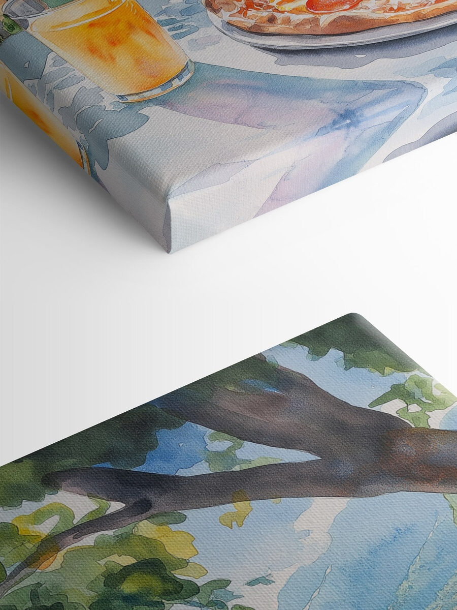 Stel je voor dat je wegzakt in een knus hoekje van je keuken, met de geur van pizza in de lucht. Dit aquarelschilderij legt dat dromerige moment vast – een heerlijk stuk peperoni pizza met verfrissende drankjes op de achtergrond van serene wateren en weelderige heuvels. Het is die perfecte ontsnapping waardoor thuis voelt als een stukje vakantie. Stel je voor dat het aan je muur hangt en warmte en plezier in je kamer brengt. Elke blik doet je denken aan die luie middagen die je met vrienden doorbrengt, lachen dat opborrelt als bruisende drankjes. Het is niet zomaar kunst; het is een stukje alledaags geluk!