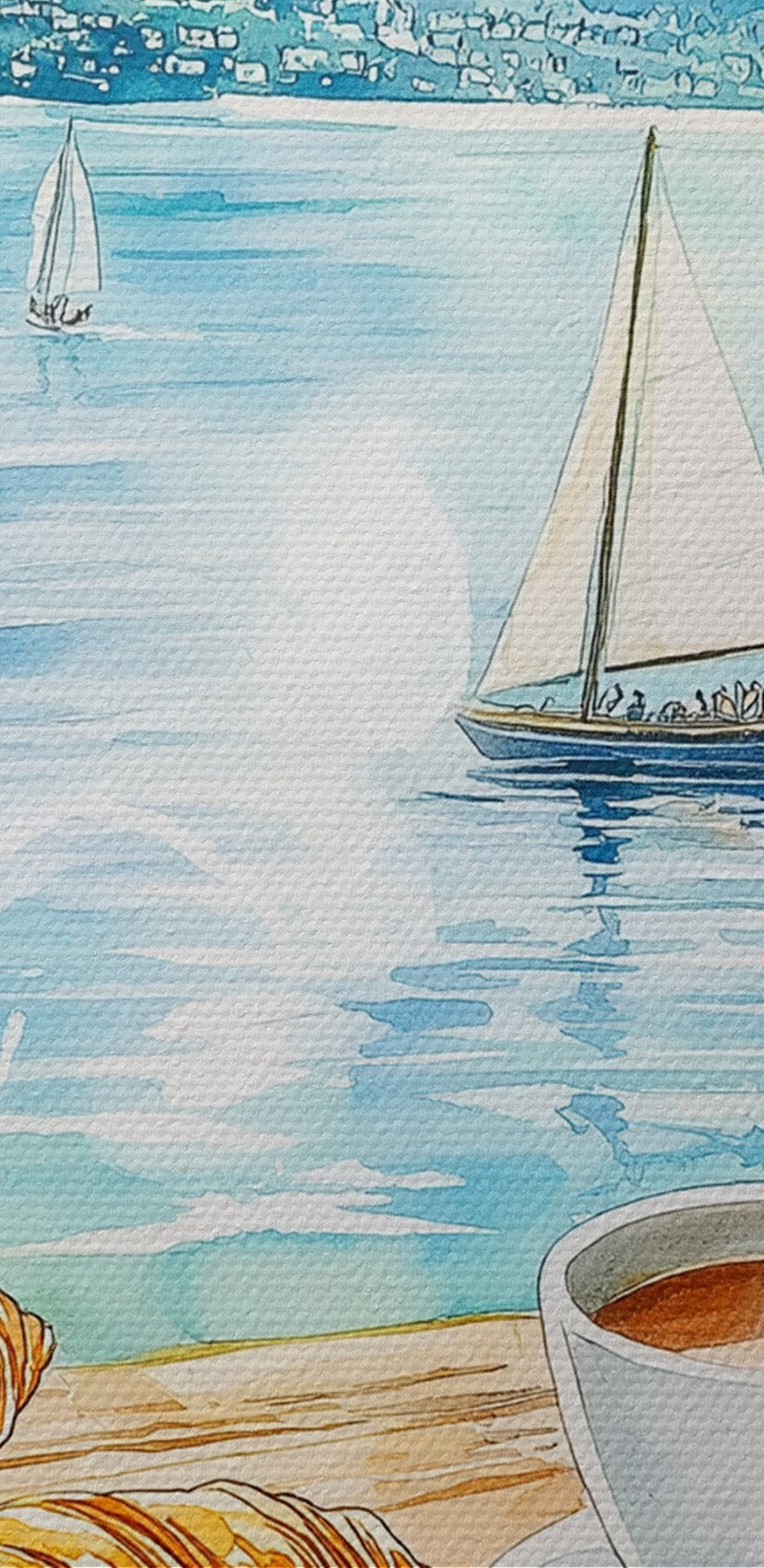Stel je voor dat je wakker wordt met de troostende geur van verse koffie en warme croissants, gewoon vanuit je eigen huis! Deze canvasprint legt dat dromerige moment vast, als een stukje caféleven zonder de drukke mensenmassa. De zachte aquarelstrepen schilderen een scène waarin zeilboten lui over een zonovergoten meer glijden, waardoor het voelt alsof je elke dag op een minivakantie bent. Het is een kunstwerk dat vreugde en ontspanning uitstraalt – perfect voor in de keuken of eethoek. Wie zou zich niet geïnspireerd voelen om een kopje te zetten en te genieten van een lekkernij door alleen maar hiernaar te kijken? Het herinnert je eraan om van de kleine dingen te genieten, want eerlijk is eerlijk, het leven is te kort om niet van koffie en croissants te genieten!