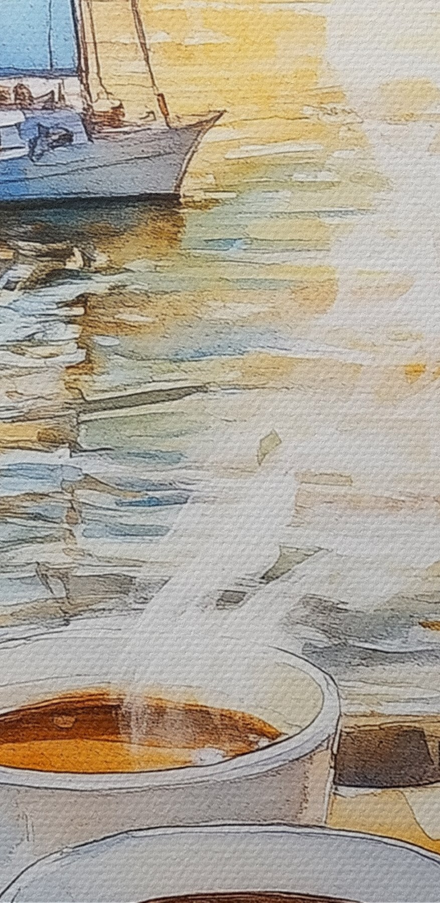 Stel je voor dat je koffie drinkt terwijl je je koestert in de warme gloed van een zonsopgang, met croissants die je naam roepen. Deze aquarel canvasprint brengt dat perfecte moment rechtstreeks naar je woonruimte. Zeilboten glijden moeiteloos over de achtergrond en voegen een vleugje sereniteit toe. Elke penseelstreek vangt de heerlijke geur van verse koffie die zich mengt met de boterachtige goedheid van gebakjes. Hang het op in je keuken of in een gezellig hoekje en misschien droom je wel van een ontspannen ontbijt aan zee. Een stukje leven, een vleugje vreugde – wat wil je nog meer?