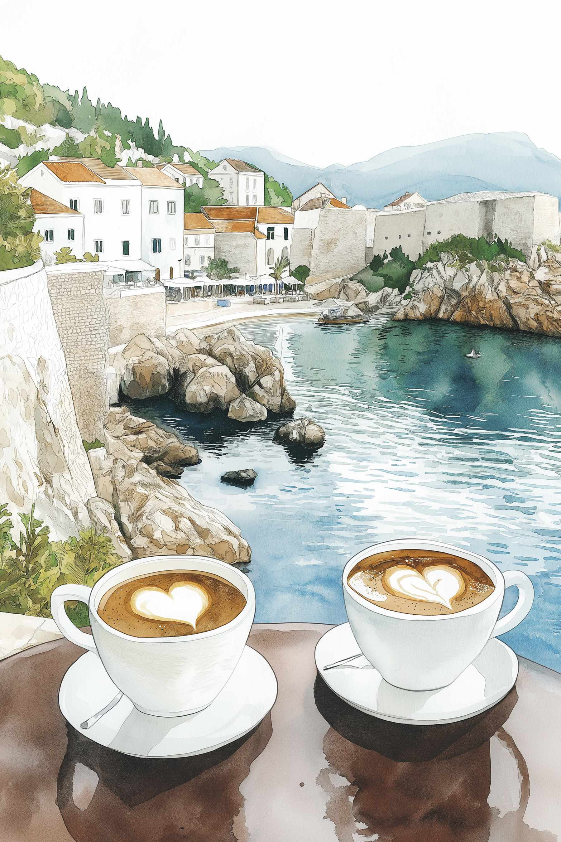 Stel je het rustgevende tafereel voor van twee kopjes koffie op een zonovergoten tafel, elk overgoten met een hartvormige schuimkraag. Dit kunstwerk legt dat gezellige moment vast en brengt een vleugje warmte en rust bij je thuis. Zie jezelf al langzaam nippend, het zachte geluid van de golven op de achtergrond en de geur van rijke koffie die de lucht vult. Het is niet zomaar een muurschildering; het is een uitnodiging om even te pauzeren, diep adem te halen en te genieten van de kleine geneugten van het leven. Perfect voor keukens of gezellige hoekjes, dit canvas kunstwerk voegt charme en een vleugje liefde toe aan elke ruimte en maakt van gewone dagen iets speciaals.