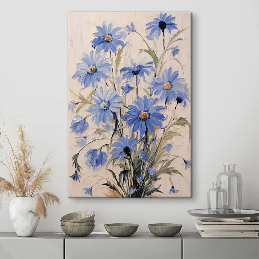 Fleur je ruimte op met deze prachtige canvasprint, “Canvas Schilderijen Schilderij van blauwe bloemen”. Het is als een frisse wind voor je muren! Stel je voor dat je een kamer binnenkomt waar deze prachtige blauwe bloemen zachtjes wiegen en zoete lenteboodschappen fluisteren. De levendige kleuren knallen tegen een zachte achtergrond, waardoor het een perfecte gespreksstarter is. Stel je een gezellige middag voor, een warm drankje in de hand en die bloemen die je meeslepen in een mini-dagdroom. Of je ze nu in een woonkamer, slaapkamer of zelfs in een zonnige hal zet, iedereen zal zich afvragen of je groene vingers hebt!