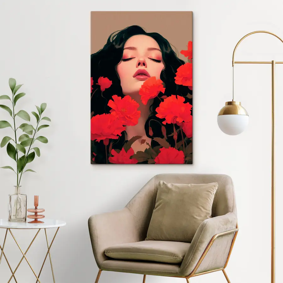 Stel je voor dat je een kamer binnenloopt en begroet wordt door een prachtige canvasprint met een vrouw met lang, wapperend zwart haar, volledig omhuld door levendige rode bloemen. Het is alsof je een droom binnenstapt, waar de kleuren bruisen van leven en elk bloemblaadje een geheim lijkt te fluisteren. Dit werk harmonieert de schoonheid van de natuur en de diepte van emotie, waardoor het perfect is voor een gezellige woonkamer of een serene slaapkamer. Eén blik erop en de zorgen van de dag smelten weg en alleen rust en inspiratie blijven over. Het is niet zomaar kunst; het is een gevoel, zoals een warme knuffel op een kille dag. Voeg een vleugje gedurfde charme toe aan uw ruimte en laat uw muren het woord doen!