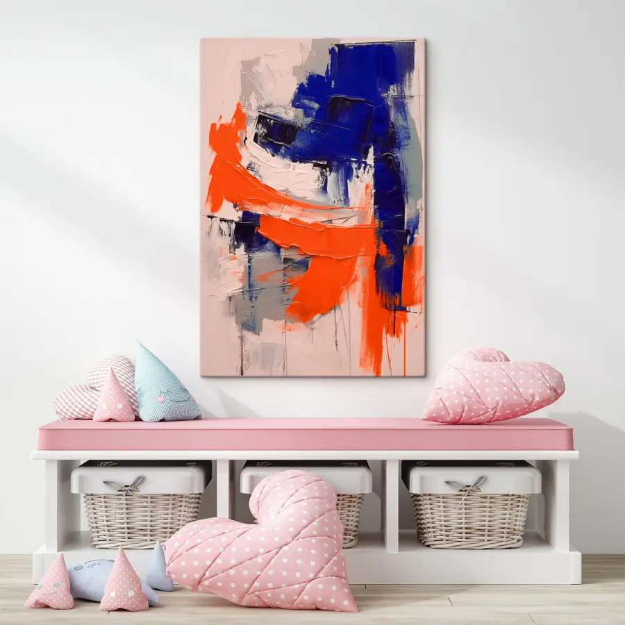 Duik in een vleugje creativiteit met deze opvallende canvasprint! Het felle blauw en het levendige oranje dansen samen, als een levendig gesprek tussen vrienden. Het is alsof de tinten speels ruziën over wie de schijnwerpers krijgt, terwijl de zachtere grijzen en witten voor een heerlijke harmonie op de achtergrond zorgen. Hang het in je woonkamer of kantoor en je kunt het kunstwerk bijna horen fluisteren: “Hé, laten we die ruimte opvrolijken!”. Het is het perfecte stuk om vrolijkheid op te wekken, creativiteit te inspireren of gewoon die muur een beetje pit te geven. Perfect voor iedereen die een vleugje plezier en persoonlijkheid aan zijn inrichting wil toevoegen!