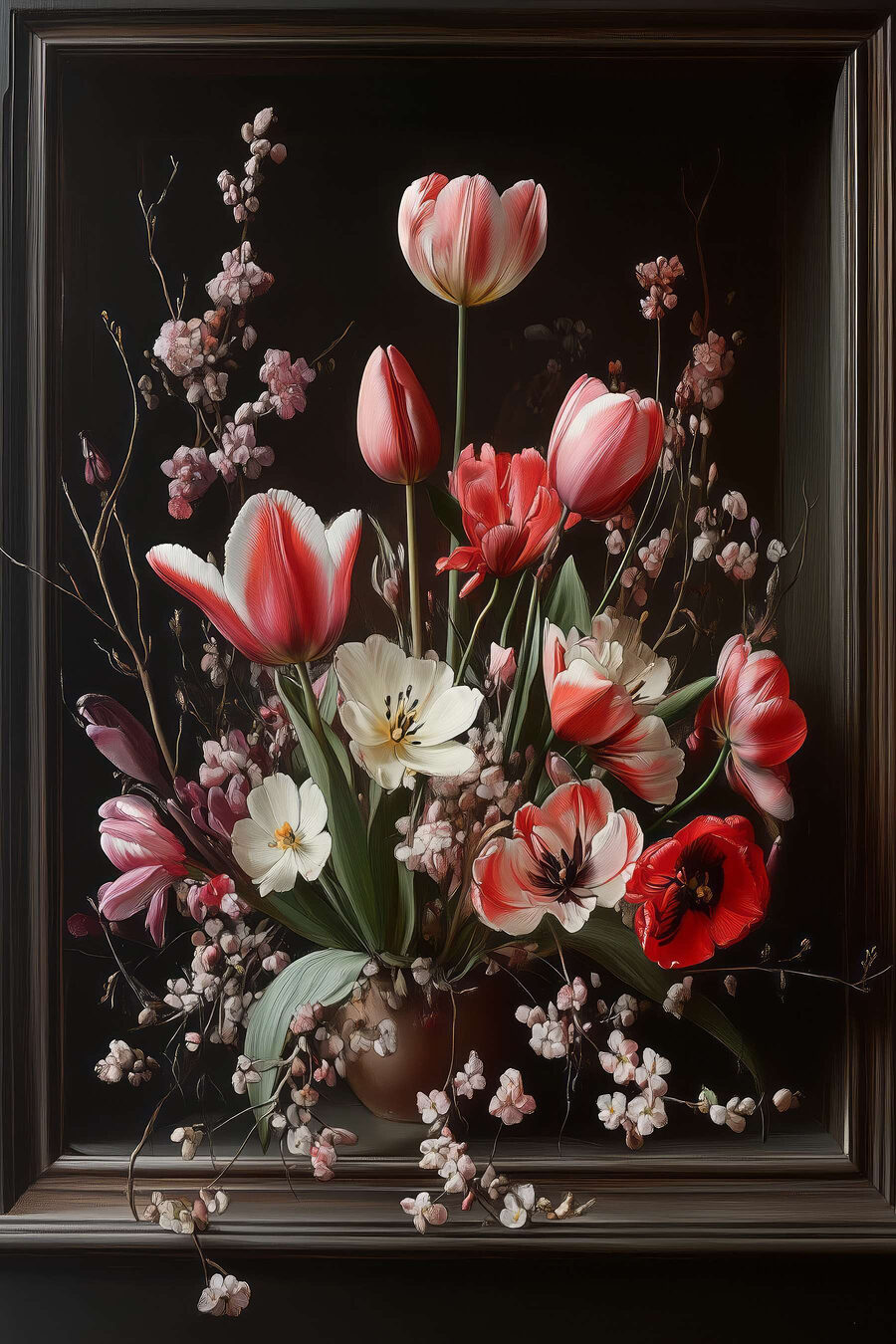 Stel je voor dat dit stuk in je woonkamer hangt, waar het het middaglicht vangt, of misschien een rustig hoekje opfleurt en een knusse sfeer geeft. Vrienden op bezoek? Ze zullen zeker even stoppen en glimlachen, misschien zullen ze zich zelfs verbazen over hoe zo’n schoonheid bij je thuis past. Bovendien hoef je geen water te geven! Of je nu een bloemenfanaat bent of gewoon van een vleugje natuur houdt, dit canvas maakt van elke kamer een vrolijkere plek. Het is kunst die spreekt – zoet, elegant en een beetje speels. Is dat geen sfeermaker?