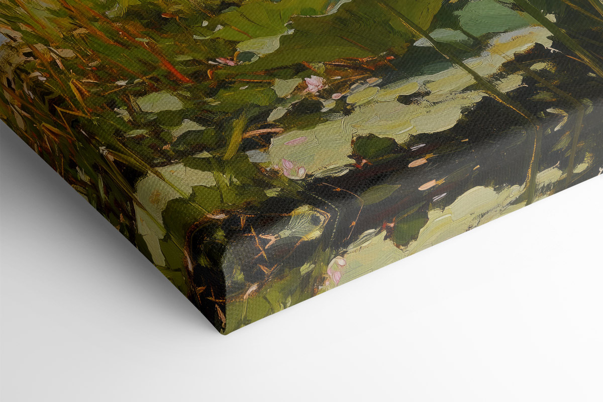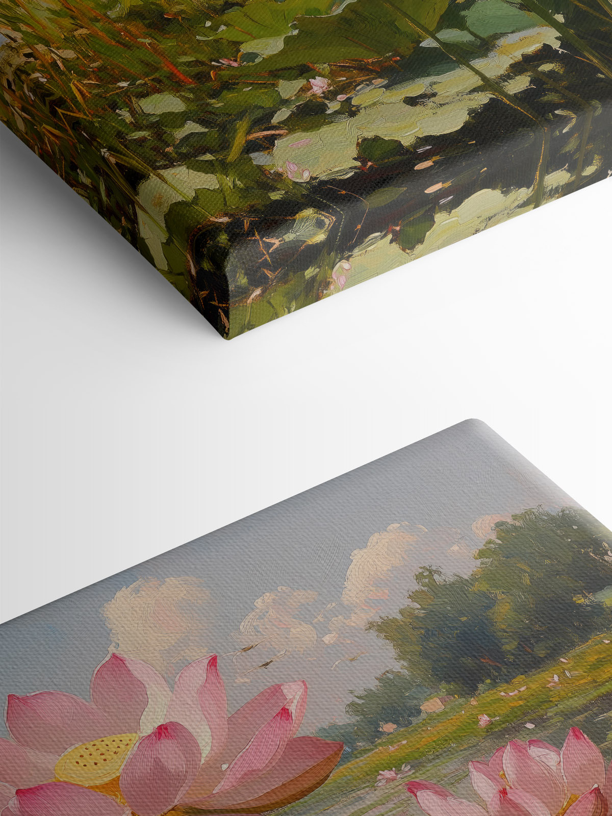 Transformeer je ruimte met deze betoverende canvasprint met roze bloemen op een sereen meer. Stel je voor: een vredige middag, de zon schijnt naar beneden en deze delicate bloemen wiegen zachtjes langs het water. Het is alsof je een stukje natuur in huis haalt. Dit stuk voegt een vleugje rust toe, perfect voor een gezellige leeshoek of een levendige woonkamer. Vrienden komen misschien wel even langs om van het uitzicht te genieten. Met elke blik herinnert het je eraan om even stil te staan, adem te halen en de kleine dingen in het leven te waarderen. Wat is er niet mooi aan?