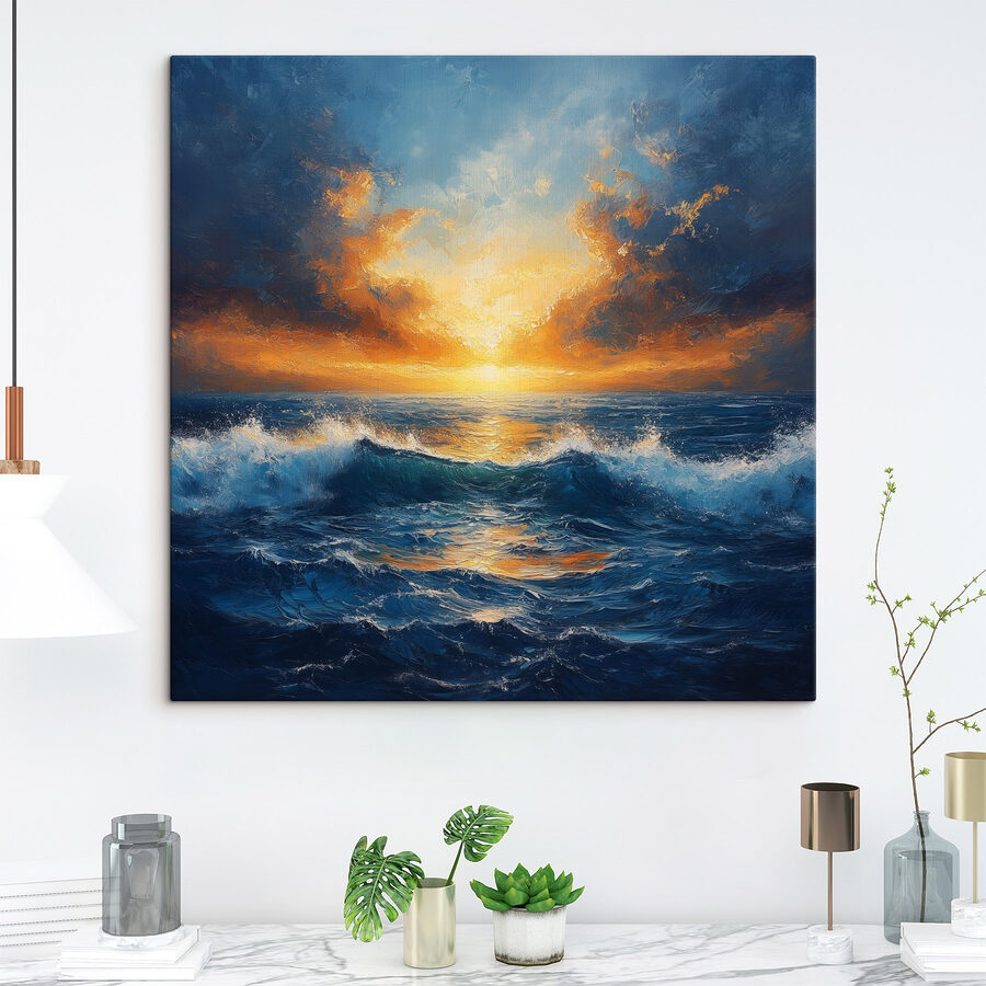 Adem de zeelucht in! Dit “Canvas Schilderijen Sunset over the Ocean” stuk brengt de verbluffende schoonheid van de natuur tot in de woonkamer. Stel je voor: je luiert op de sofa en deze levendige zonsondergang is slechts een blik verwijderd. De kleuren knallen – vurige sinaasappels, diep blauw en kalme golven – ze spelen allemaal samen als een dansfeest bij zonsondergang. Het is bijna alsof de oceaan geheimen fluistert terwijl jij aan je koffie nipt. Perfect voor die dagen dat je even wilt ontsnappen of inspiratie nodig hebt. Hang het op, leun achterover en laat je zorgen wegdrijven, golf na golf. Het is een dagelijkse herinnering aan het wonder van de natuur zonder dat je een strandlaken nodig hebt.