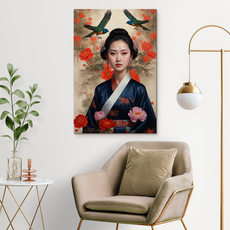 Transformeer je kamer met deze prachtige canvasprint van een vrouw in een kimono, omringd door levendige bloemen en sierlijke vogels. De kleuren springen bijna van het doek af en brengen leven en elegantie in elke kamer. Stel je dit stuk voor als een conversatie starter tijdens bijeenkomsten of als een rustige achtergrond tijdens die rustige momenten met een kopje thee. Het is alsof je een minivakantie hebt in een rustige tuin, gewoon thuis! Perfect voor iedereen die houdt van een vleugje natuurschoon gemengd met een vleugje culturele charme. Geloof ons, je muren zullen je dankbaar zijn!