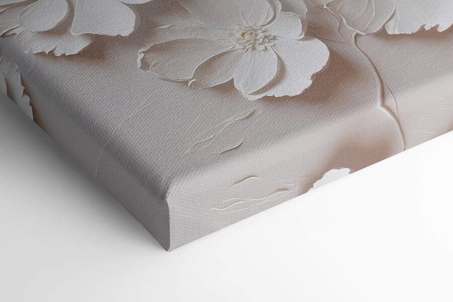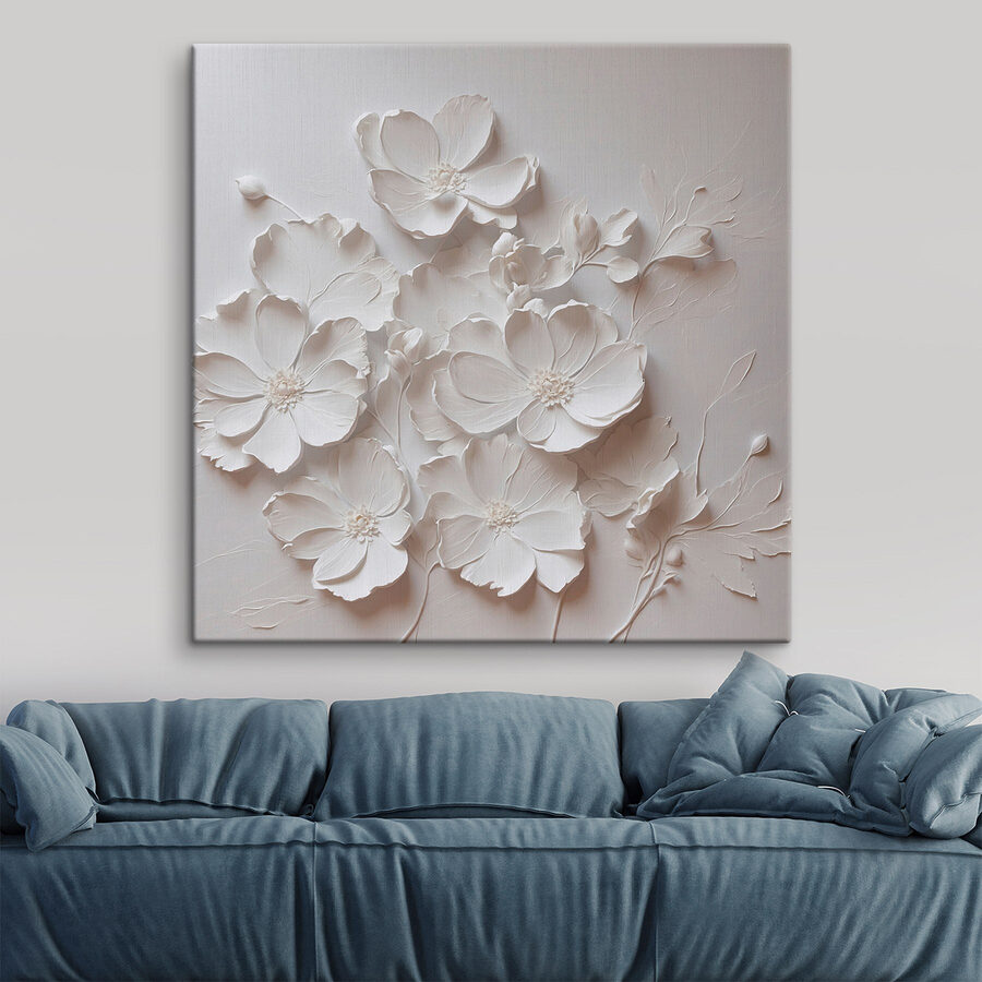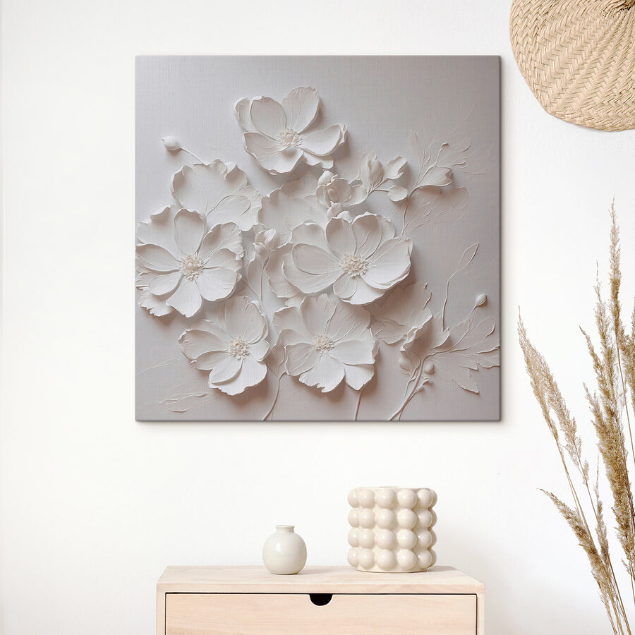 Stel je voor dat je een kamer binnenloopt en begroet wordt door een prachtig doek dat de delicate schoonheid van witte bloemen vastlegt. Dit kunstwerk met zijn zachte, etherische uitstraling voelt aan als een zacht gefluister van de natuur en brengt een kalme, serene energie in elke ruimte. Het is perfect voor rustige ochtenden met koffie of gezellige avonden met een goed boek.