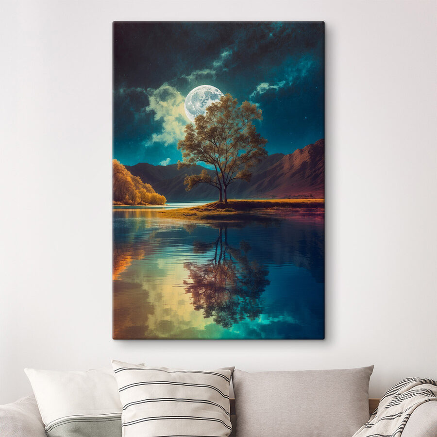 Stel je een serene nacht aan het water voor, waar een eenzame boom trots staat onder de gloed van een reusachtige maan. Dat is de sfeer die “Canvas Schilderijen Tree on the Water” in je interieur brengt. De zachte tinten en opvallende reflecties nodigen je uit om even stil te staan en diep adem te halen – perfect voor die momenten waarop het leven een beetje te hectisch wordt. Het is alsof je een stukje vredige natuur in huis haalt, zonder de insecten. Hang het in je woonkamer en je zult in gedachten verzonken zijn en misschien zelfs dromen van een ontsnapping aan het meer. Een vleugje rust, een vleugje magie – een echte showstopper!
