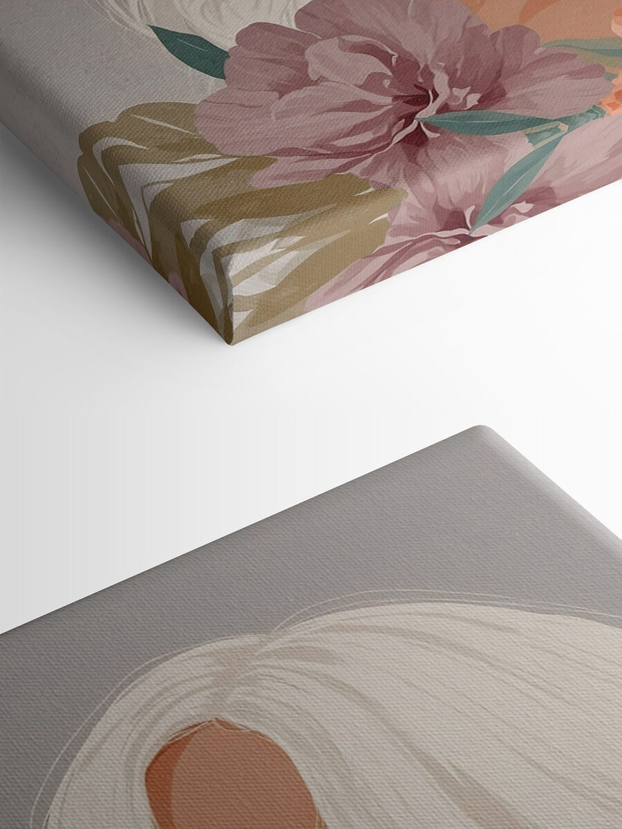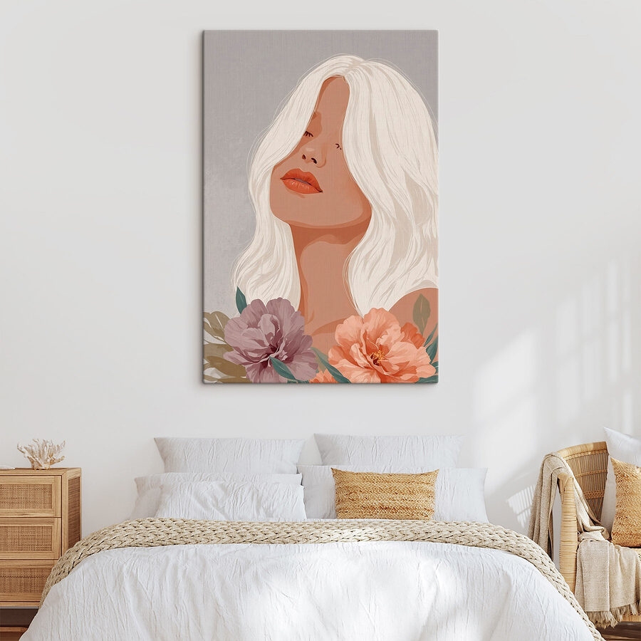 Transformeer elke kamer met deze prachtige canvasprint van een serene vrouw met lang wit haar, omringd door zachte bloemen. Het is alsof je een frisse wind door je kamer laat waaien. Stel je een knus hoekje voor waar je je oprolt met een kopje thee en naar haar stille schoonheid kijkt terwijl je wegdroomt – het is pure magie. De zachte tinten van de bloemen zijn zo uitnodigend dat ze misschien wel “laten we ontspannen” fluisteren telkens als je langsloopt. Perfect om een vleugje elegantie en natuurlijke charme aan je muren toe te voegen, het is het soort kunst dat gasten zal doen stilstaan en glimlachen. Een klein bloemenwonderland bij je thuis – wie zou dat niet willen? Bovendien zal het zeker een gesprek op gang brengen, want laten we eerlijk zijn, kunst als deze blijft niet stilzitten, maar nodigt uit tot verhalen en inspiratie.