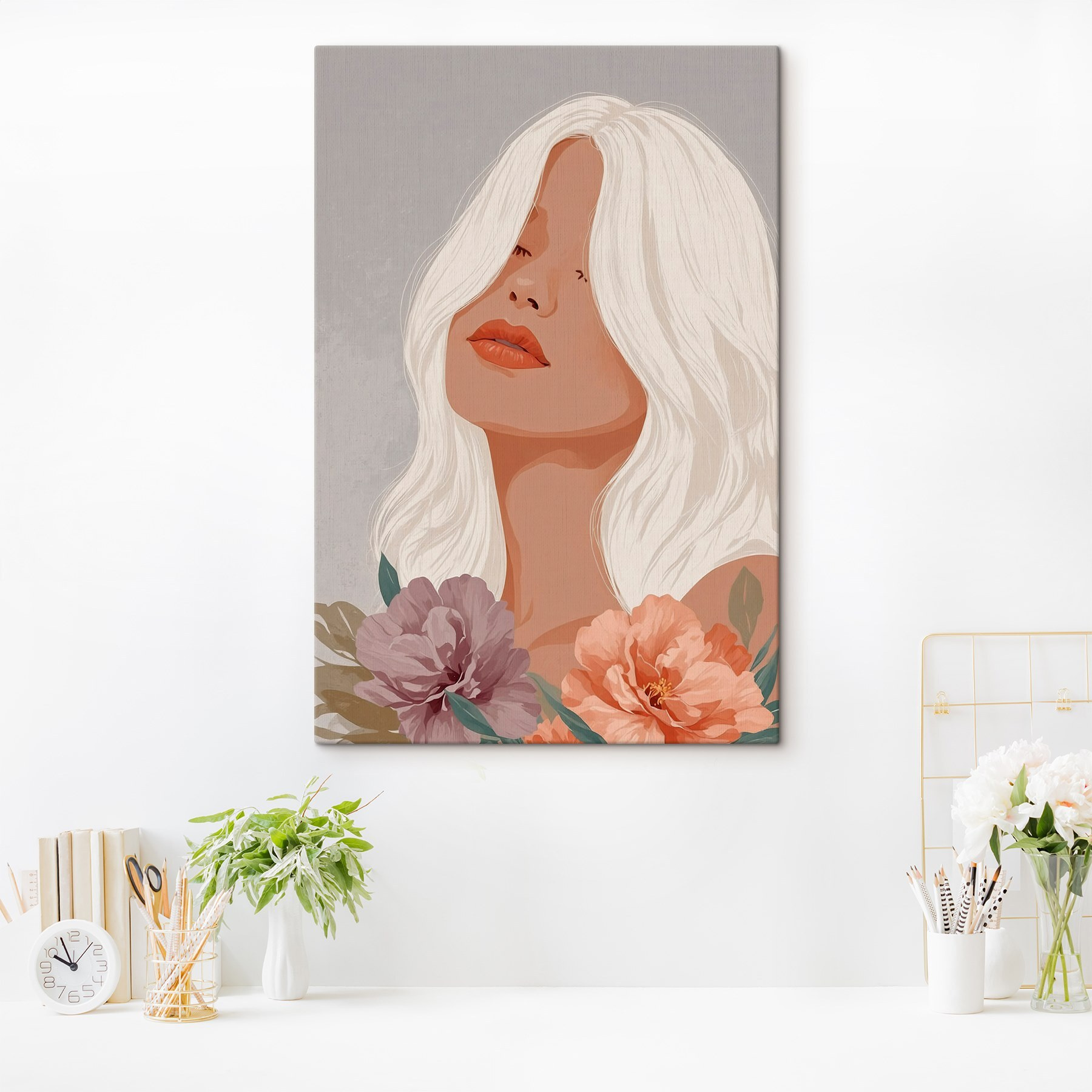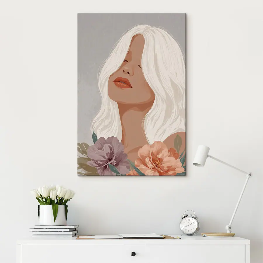Transformeer elke kamer met deze prachtige canvasprint van een serene vrouw met lang wit haar, omringd door zachte bloemen. Het is alsof je een frisse wind door je kamer laat waaien. Stel je een knus hoekje voor waar je je oprolt met een kopje thee en naar haar stille schoonheid kijkt terwijl je wegdroomt – het is pure magie. De zachte tinten van de bloemen zijn zo uitnodigend dat ze misschien wel “laten we ontspannen” fluisteren telkens als je langsloopt. Perfect om een vleugje elegantie en natuurlijke charme aan je muren toe te voegen, het is het soort kunst dat gasten zal doen stilstaan en glimlachen. Een klein bloemenwonderland bij je thuis – wie zou dat niet willen? Bovendien zal het zeker een gesprek op gang brengen, want laten we eerlijk zijn, kunst als deze blijft niet stilzitten, maar nodigt uit tot verhalen en inspiratie.