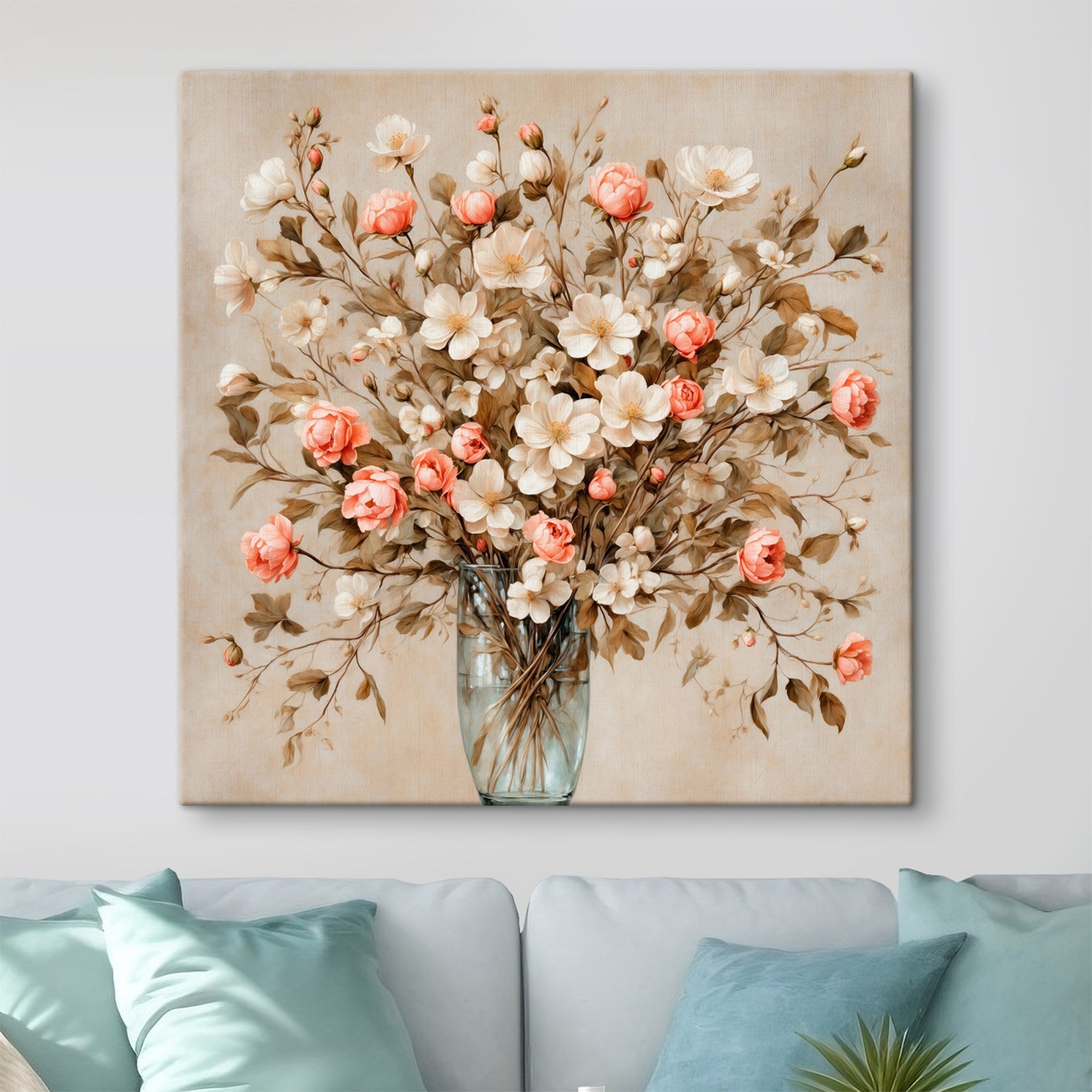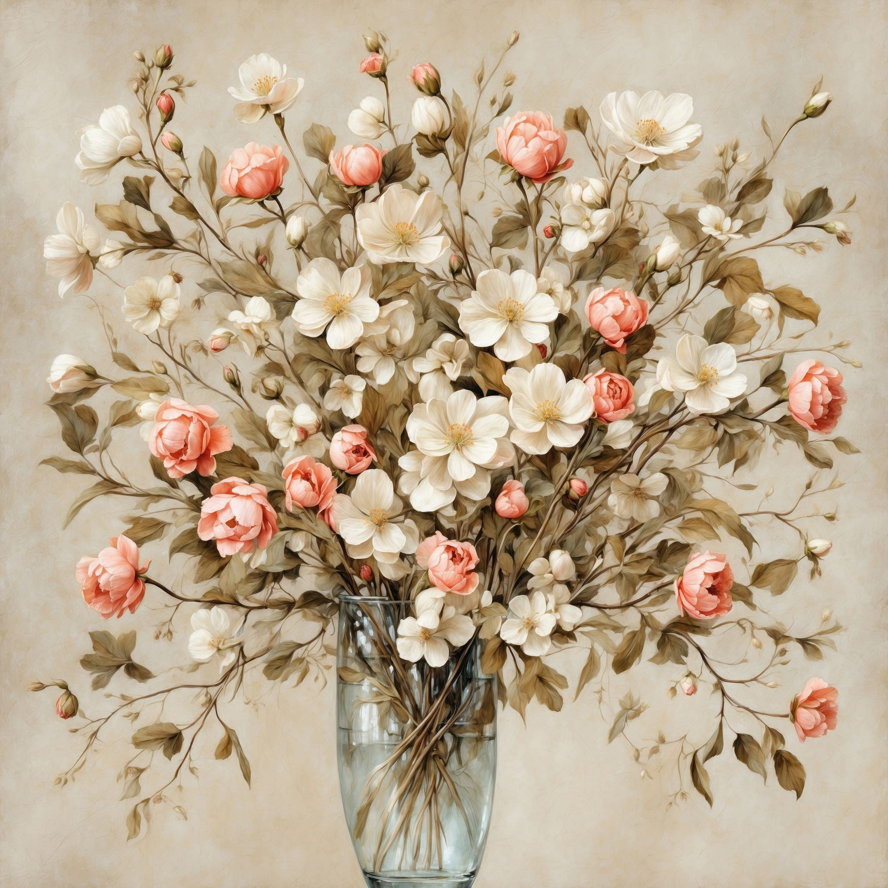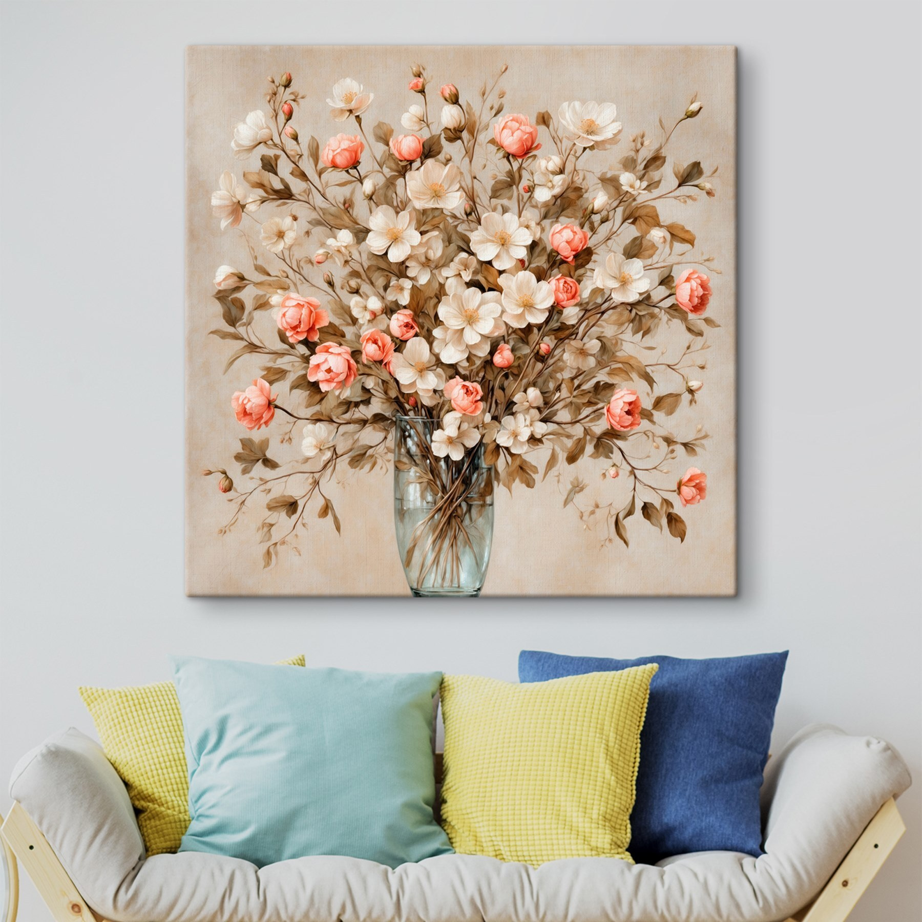 Fleur je kamer op met deze prachtige canvasprint van bloemen in een vaas. Stel je voor dat je een kamer binnenloopt en begroet wordt door deze heerlijke uitbarsting van bloemen – perfect voor de dagen dat je wel wat extra vrolijkheid kunt gebruiken. De zachte roze- en crèmetinten dansen samen en brengen een vleugje natuurschoon binnenshuis, zonder de pollen (gelukkig maar).