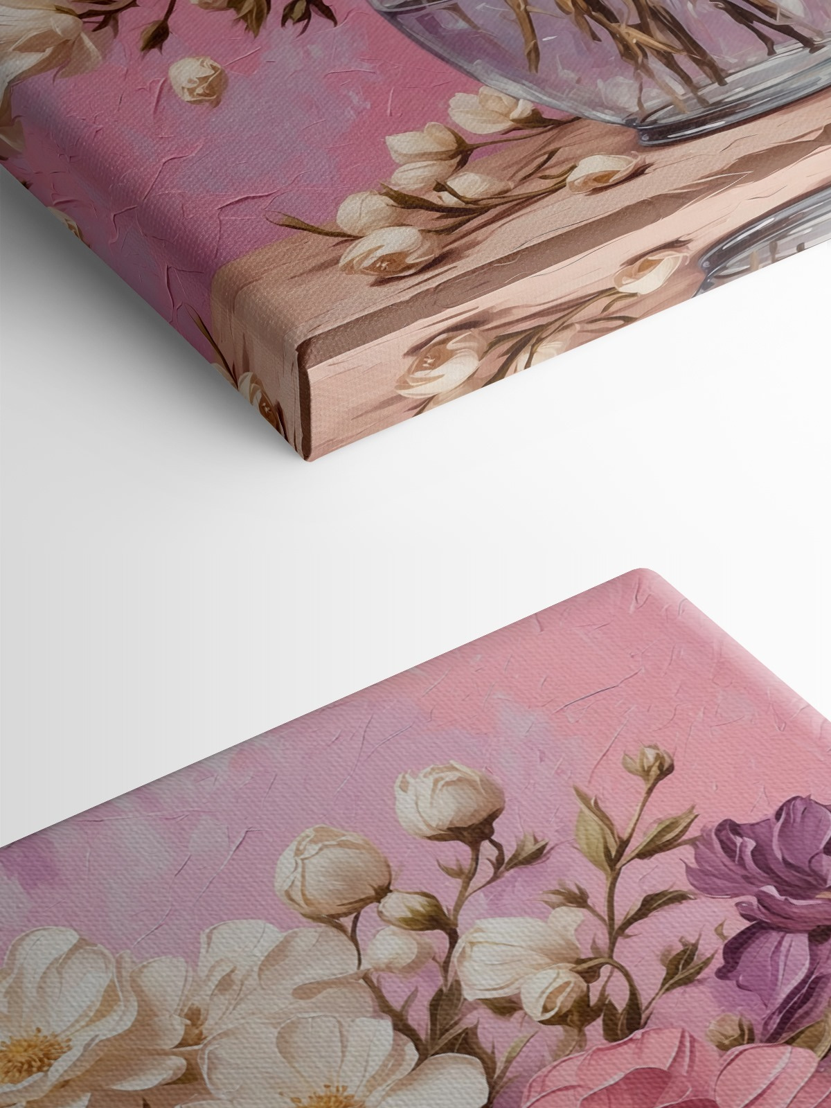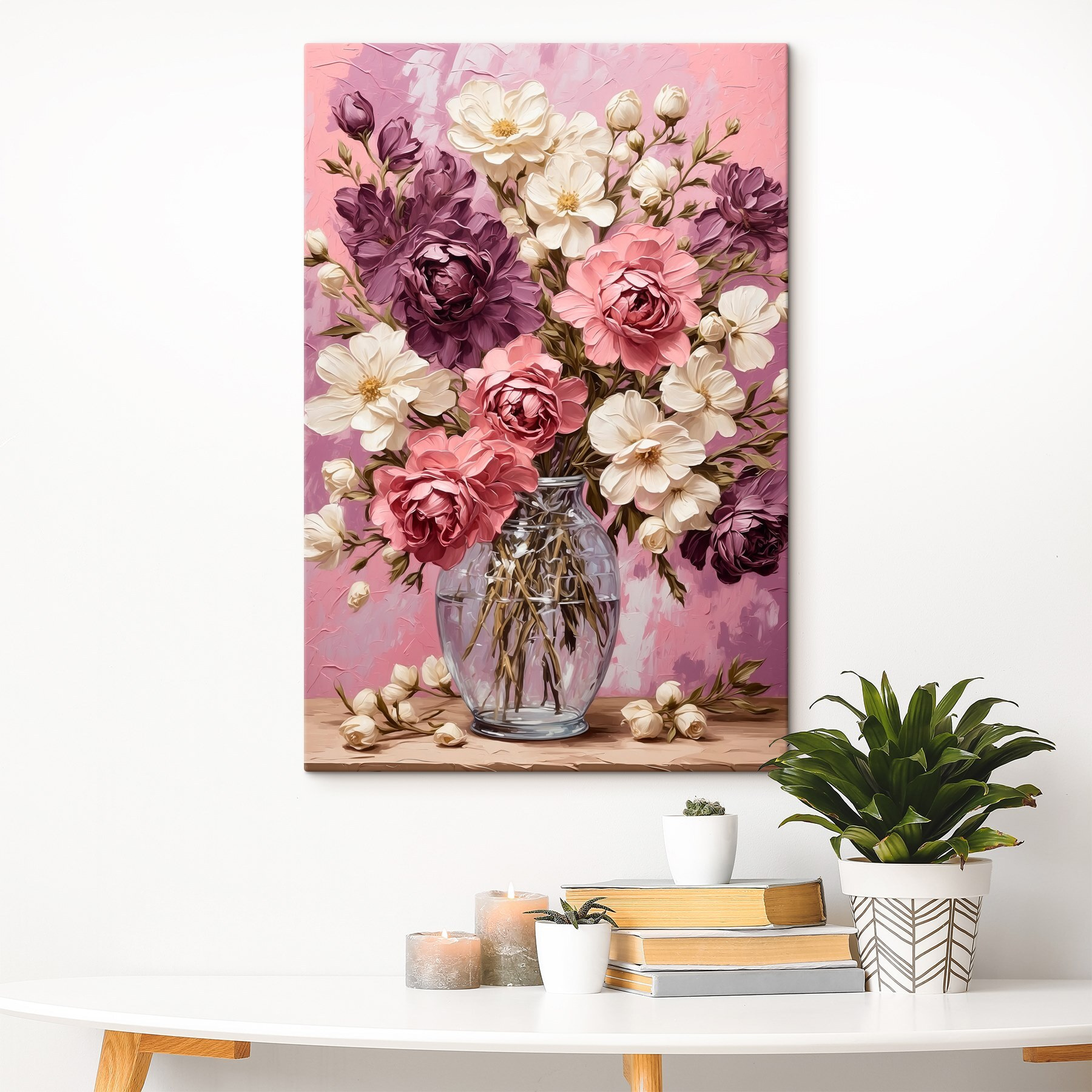 Met deze Canvas Print van levendige bloemen in een vaas haal je een tuin in huis, zonder het niezen van de pollen! De zachte roze en paarse tinten dansen samen en creëren een gelukzalige sfeer die perfect is voor een gezellige leeshoek of die lege muur die je blijft aanstaren. Stel je voor dat je aan je koffie nipt met dit mooie kunstwerk in de buurt, een vrolijk vleugje kleur dat je humeur opkrikt. Het is een mooie herinnering aan de schoonheid van de natuur, misschien inspireert het je om je eigen groene vingers te verzorgen, of gewoon te genieten van het uitzicht vanuit de verte. Perfect voor bloemenliefhebbers en liefhebbers van een vleugje creativiteit!