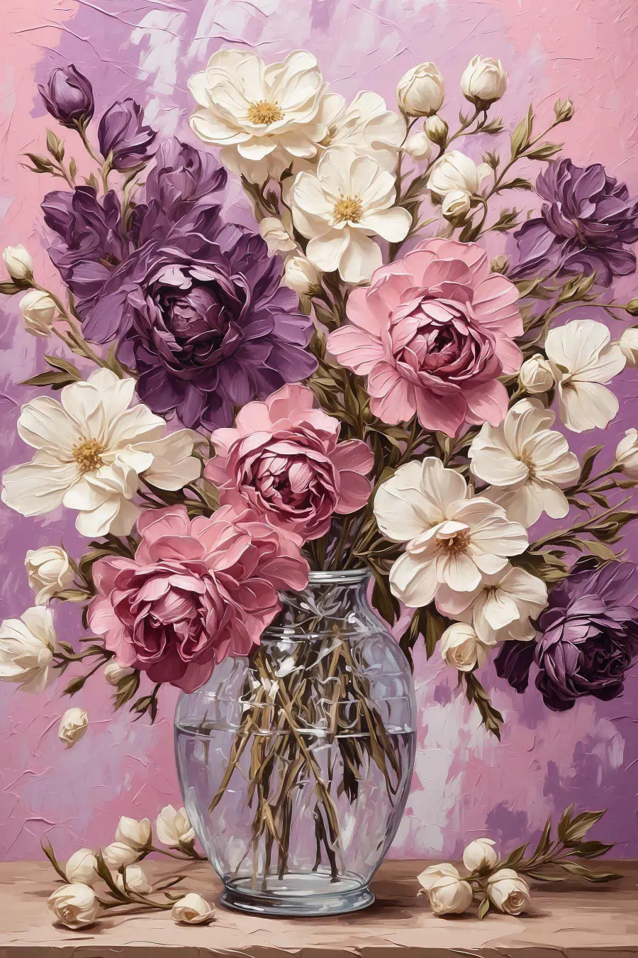 Met deze Canvas Print van levendige bloemen in een vaas haal je een tuin in huis, zonder het niezen van de pollen! De zachte roze en paarse tinten dansen samen en creëren een gelukzalige sfeer die perfect is voor een gezellige leeshoek of die lege muur die je blijft aanstaren. Stel je voor dat je aan je koffie nipt met dit mooie kunstwerk in de buurt, een vrolijk vleugje kleur dat je humeur opkrikt. Het is een mooie herinnering aan de schoonheid van de natuur, misschien inspireert het je om je eigen groene vingers te verzorgen, of gewoon te genieten van het uitzicht vanuit de verte. Perfect voor bloemenliefhebbers en liefhebbers van een vleugje creativiteit!