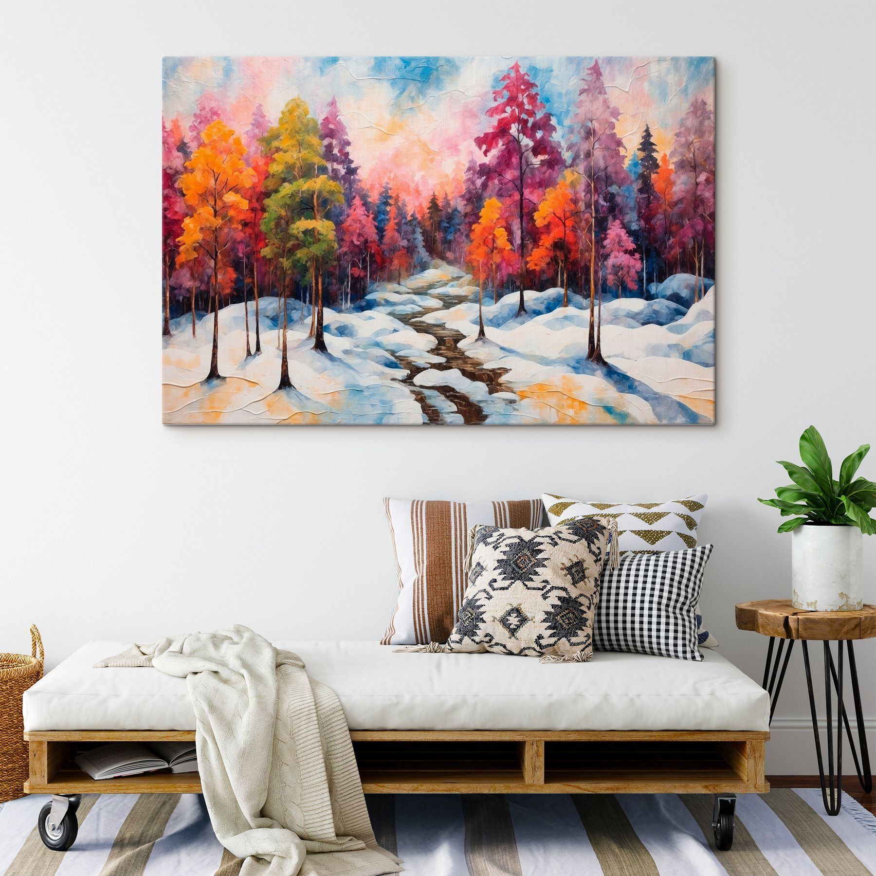 Stel je voor dat je aan warme chocolademelk nipt terwijl je naar dit dromerige besneeuwde woud kijkt. Het is net een knusse knuffel voor aan je muur, vind je niet? Op dit levendige doek steken bomen in vurige herfstkleuren af tegen een kraakheldere, witte sneeuwdeken – over een showstopper gesproken! Eén blik op het kabbelende beekje dat door het besneeuwde landschap kronkelt en je krijgt het misschien wel koud, zelfs op de warmste dagen. Perfect om een vleugje natuur binnenshuis te brengen, het creëert een serene sfeer zonder een woord te zeggen. Dus of je nu tot rust komt na een lange dag of een spontane bijeenkomst organiseert, dit kunstwerk is klaar om de show te stelen en een gesprek op gang te brengen.