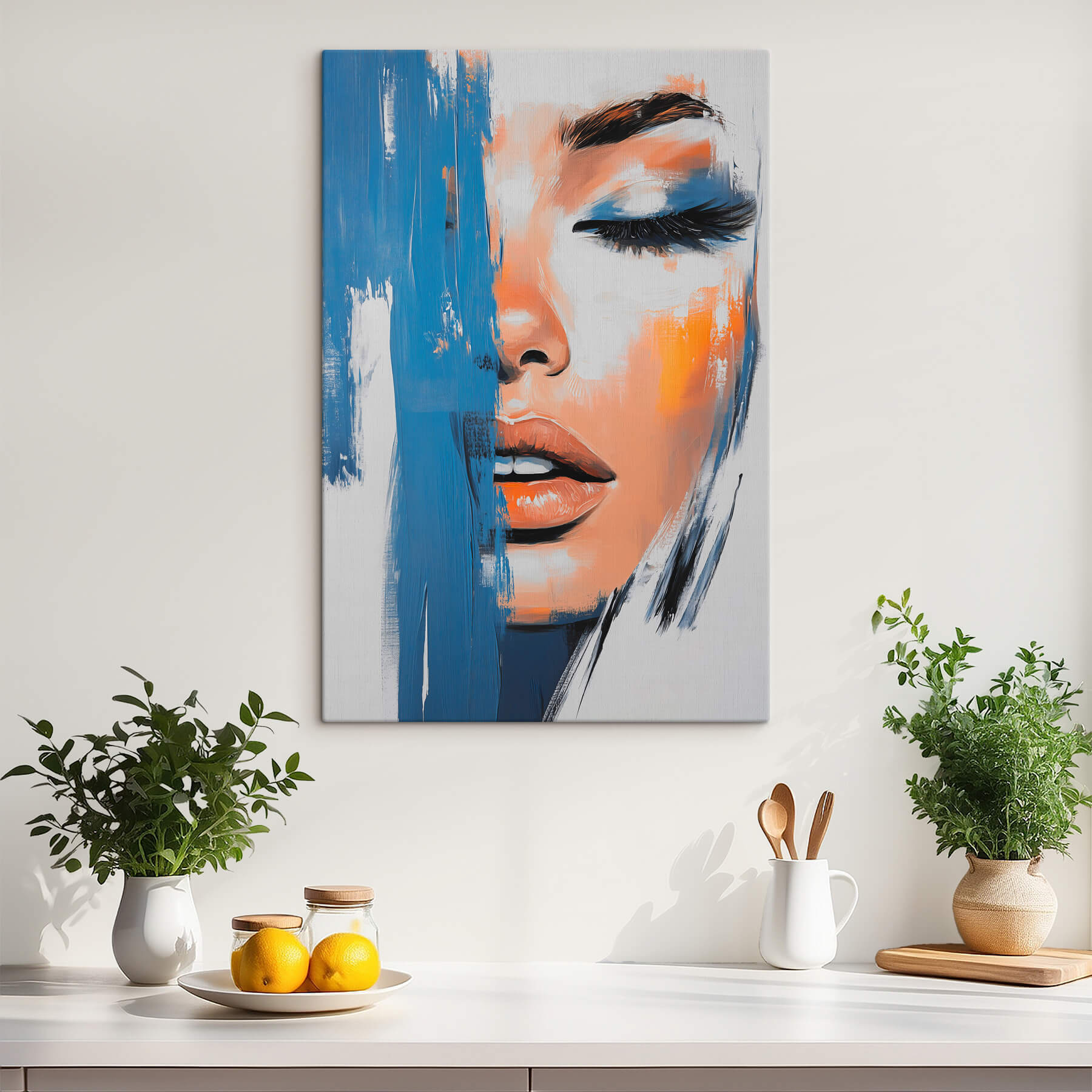 Breng een vleugje gedurfde schoonheid in je interieur met deze boeiende canvasprint. Met een opvallende afbeelding van het gezicht van een vrouw die gedeeltelijk verborgen wordt door levendige blauwe strepen, is dit het perfecte middelpunt voor iedereen die van een unieke inrichting houdt. Stel je voor dat je een kamer binnenloopt en je ogen worden meteen naar dit dramatische kunstwerk getrokken. Het fluistert verhalen, roept emoties op en stimuleert gesprekken. Het is geweldig voor een woonkamer of zelfs die gezellige leeshoek – waar het ook terechtkomt, het zal de boel zeker op stelten zetten. Voeg een vleugje intrige toe en zie de complimenten binnenstromen!