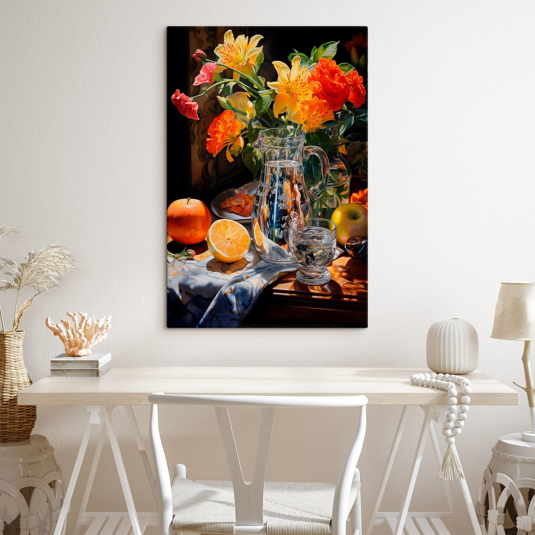 Verfraai je kamer met deze opvallende canvasprint “Stilleven met bloemen en fruit”. Het is als een stukje natuur, boordevol kleuren die iedereen aan het glimlachen maken. Stel je de zachte bloemblaadjes en het sappige fruit voor, die je uitnodigen voor een hapje. De weerspiegeling in de glazen kan geeft het hele tafereel een levendig gevoel – alsof je bijna het zachte gerinkel van de ijsblokjes tegen het glas kunt horen. Dit kunstwerk is perfect voor woonkamers of keukens en geeft elke muur een warme, uitnodigende uitstraling. Het is meer dan alleen decor; het is een dagelijkse herinnering om even stil te staan, aan de bloemen te ruiken en de simpele geneugten van het leven te waarderen. En wie wil er nu niet een vleugje bloemenflair? Hang hem op, schenk jezelf een drankje in en geniet van het uitzicht!