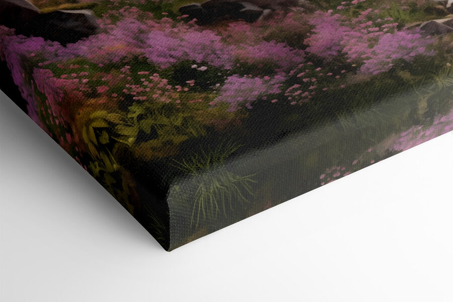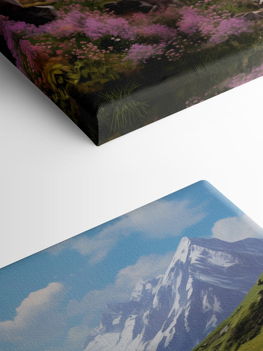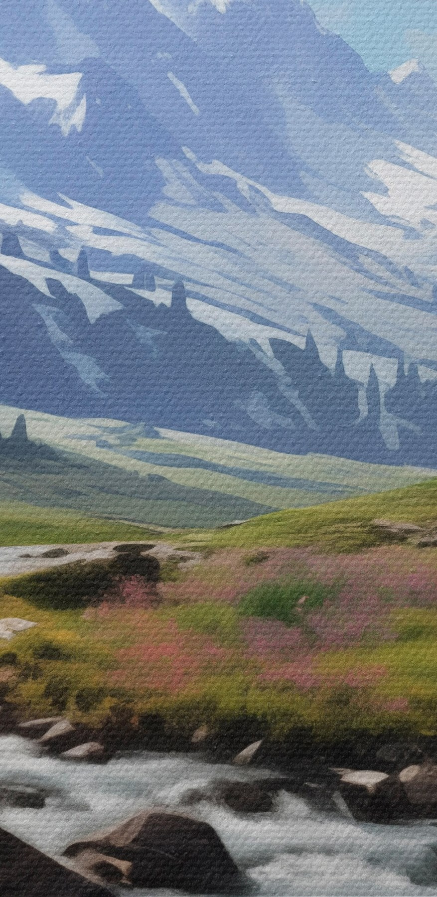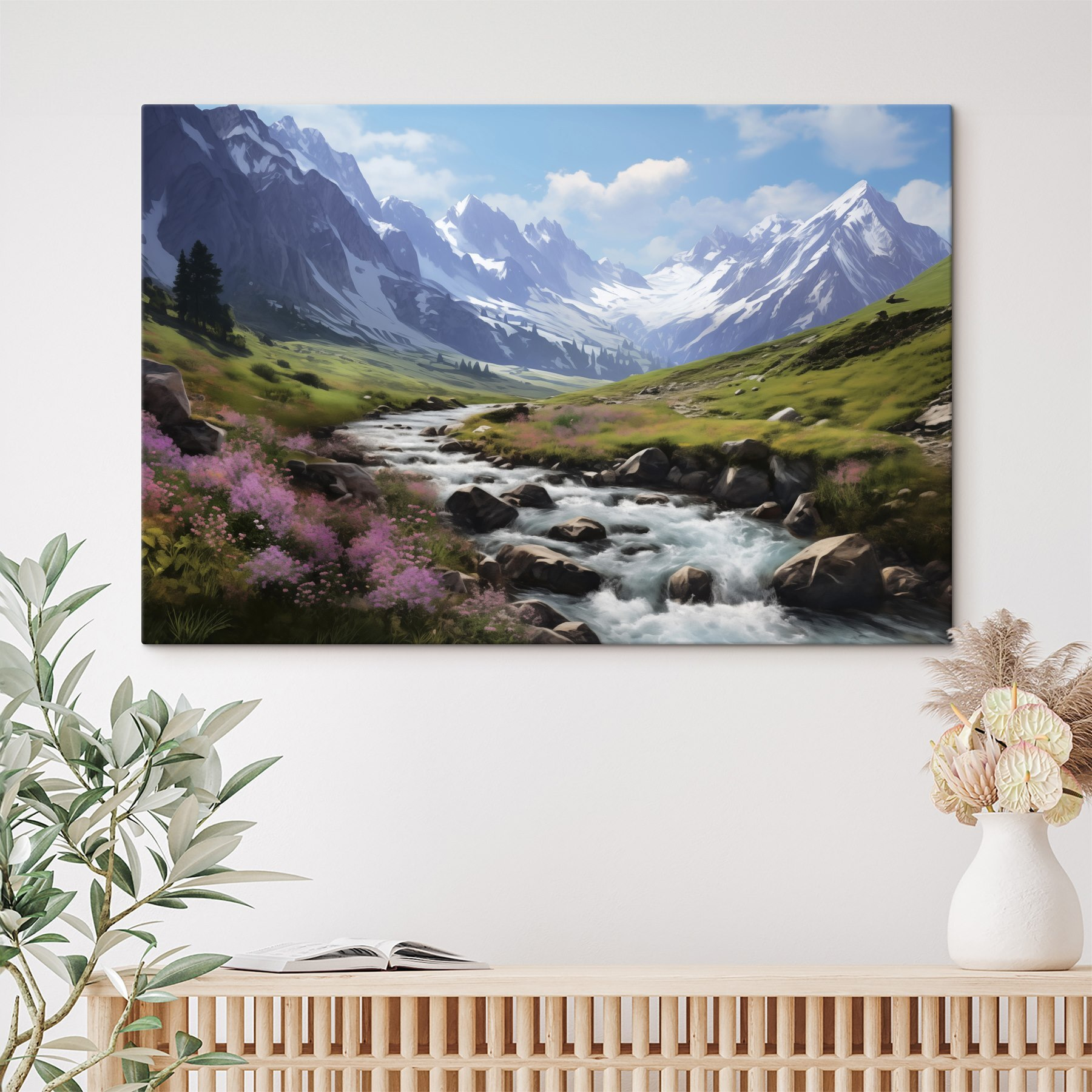 Stel je voor: een sprankelende rivier die door een weelderige vallei kronkelt, geflankeerd door majestueuze, met sneeuw bedekte bergen. Deze canvasprint is als een mini-vakantie in je woonkamer. Stel je voor dat je thee drinkt terwijl je naar de levendige roze bloemen in het landschap staart, de kleuren zo levendig dat ze bijna zoemen van vreugde. Het is een serene ontsnapping aan de alledaagse drukte, een herinnering dat de schoonheid van de natuur slechts een oogopslag verwijderd is. Dit kunstwerk fluistert kalmte, waardoor elke ruimte vrediger aanvoelt. Perfect om te dagdromen of gewoon om je gedachten te laten dwalen. Het gaat erom een beetje natuur naar binnen te halen – wie wil dat nou niet?