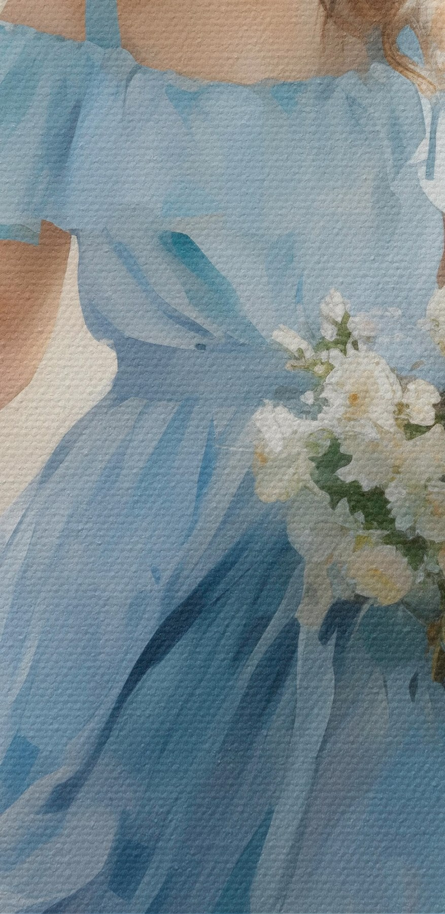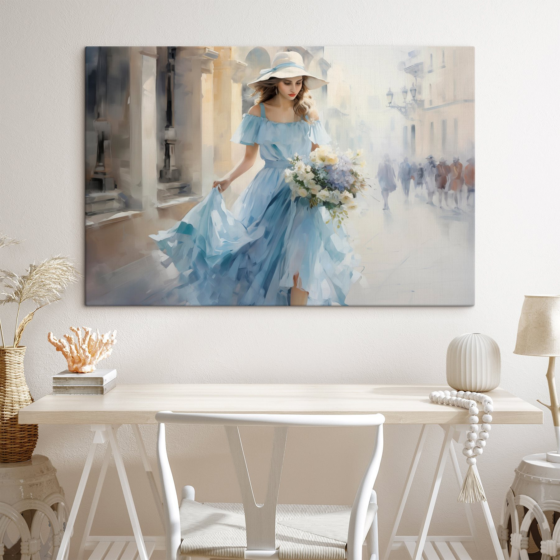 Stel je een serene middag voor, waar een mooie vrouw in een fladderende blauwe jurk zachtjes door een zonovergoten straat wandelt, bloemen in de hand – over een dagdroom gesproken! Deze canvasprint legt dat magische moment perfect vast. De zachte blauwtinten en delicate bloemen lijken warmte en charme in elke ruimte te fluisteren. Het is alsof je een vleugje vreugde op je muur hebt hangen.