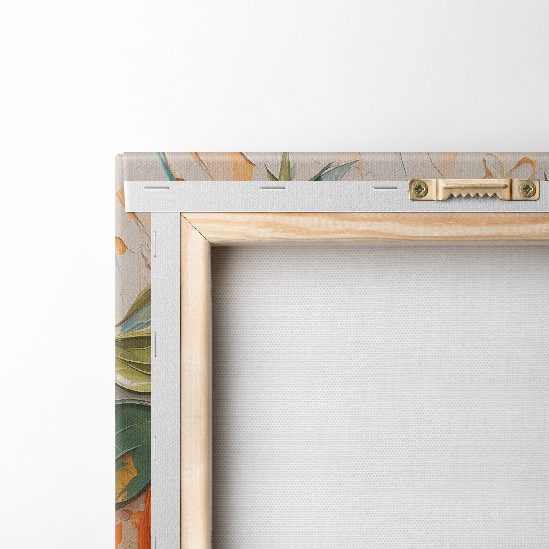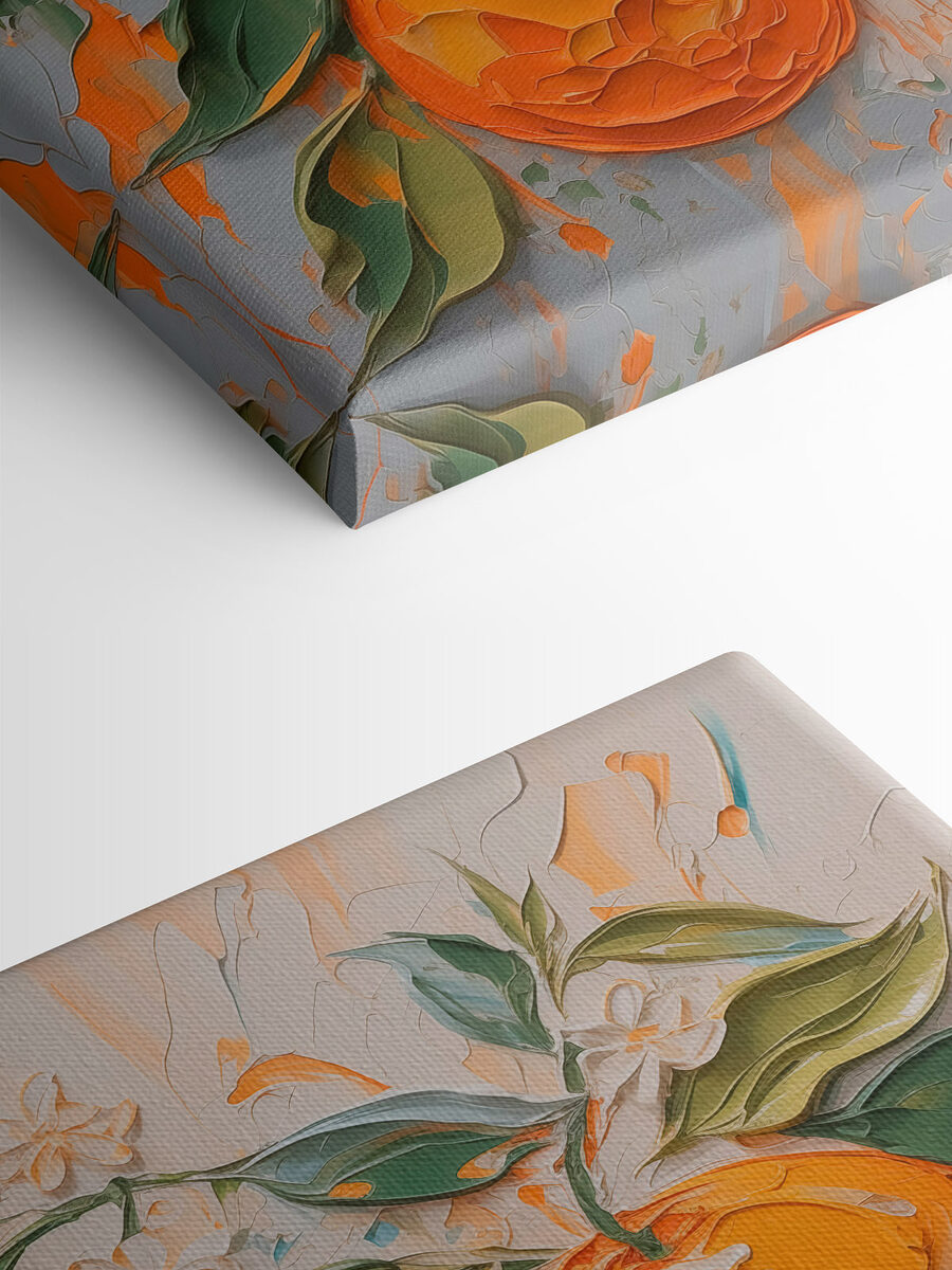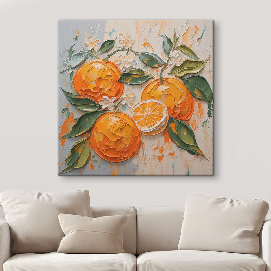 Fleur je kamer op met deze canvasprint met vrolijke sinaasappels en weelderige groene bladeren. Het is als een stukje levendigheid uit de natuur, perfect voor die momenten dat je een vleugje kleur in je dag nodig hebt. Stel je voor dat je er elke ochtend langs loopt en de energie voelt die het met zich meebrengt, alsof je de citrusvruchten in de lucht bijna kunt ruiken. De speelse wervelingen en levendige tinten wekken direct vreugde op, waardoor elke kamer fris en levendig aanvoelt. Dit kunstwerk is ideaal voor een keuken of een gezellig hoekje en zal zeker een glimlach op je gezicht toveren en misschien zelfs zin geven in een zomerse fruitsalade. Wie wist dat decoratie zo lekker kon zijn?