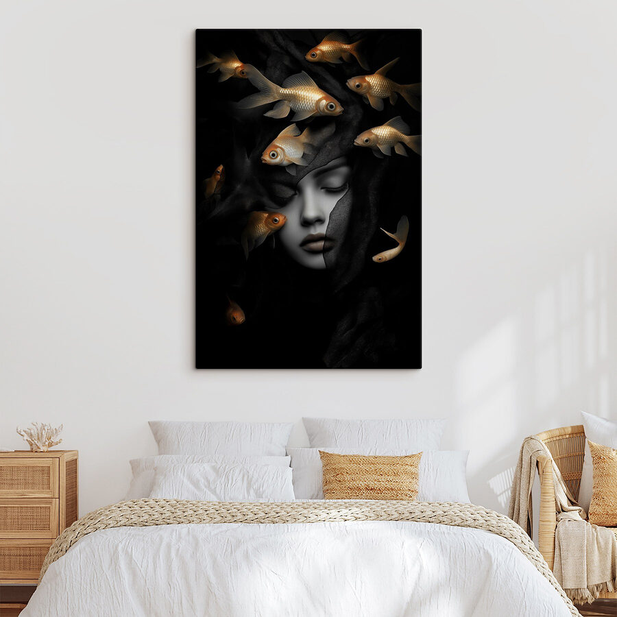 Maak kennis met “Canvas Schilderijen Floating Dreams and Silent Whispers”, een prachtig stuk dat uitnodigt tot een gevoel van rust in je interieur. Stel je dit eens voor: een sereen gezicht dat tevoorschijn komt uit schimmige diepten, versierd met sierlijke vissen die lijken te zweven in een dromerige harmonie. Het is als een portaal naar een andere wereld, waar elke blik een nieuw gevoel oproept. Deze kunst is perfect voor een knus hoekje of het middelpunt van een woonkamer en is een balans tussen eigenaardigheid en mysterie. Vrienden zullen misschien vragen om wat langer te blijven hangen, aangetrokken door de betoverende allure. Laat dit doek een vleugje verbeelding en rust brengen aan je muren!