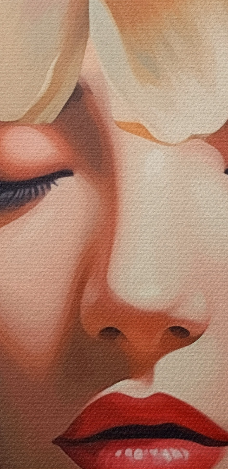Maak kennis met “Woman with Flowers Around Her Head”, een canvasprint die als een frisse lentebries in je interieur is. Stel je voor dat je een kamer binnenloopt en begroet wordt door deze serene schoonheid, haar zachte gelaatstrekken omlijst door levendige bloemen. Het is alsof ze je uitnodigt om het wat rustiger aan te doen en te genieten van de kleine dingen.