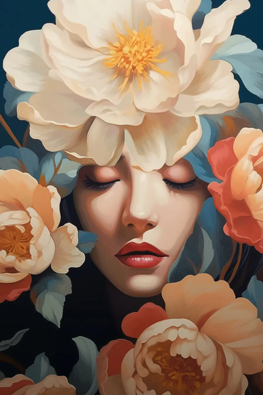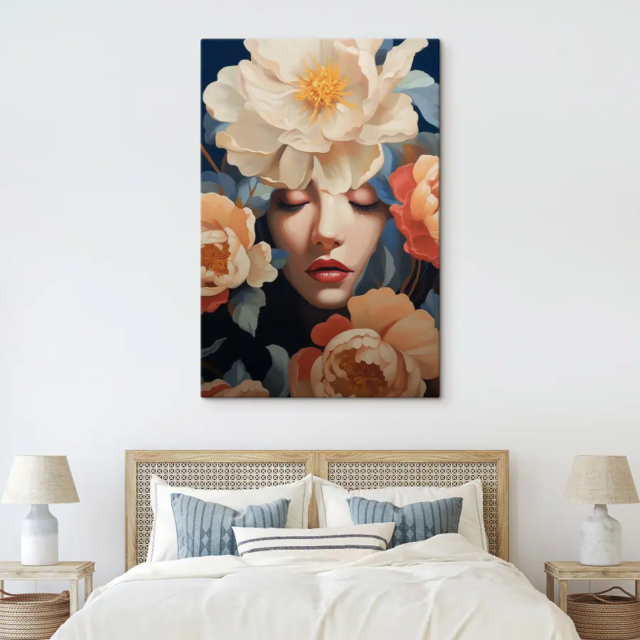 Maak kennis met “Woman with Flowers Around Her Head”, een canvasprint die als een frisse lentebries in je interieur is. Stel je voor dat je een kamer binnenloopt en begroet wordt door deze serene schoonheid, haar zachte gelaatstrekken omlijst door levendige bloemen. Het is alsof ze je uitnodigt om het wat rustiger aan te doen en te genieten van de kleine dingen.