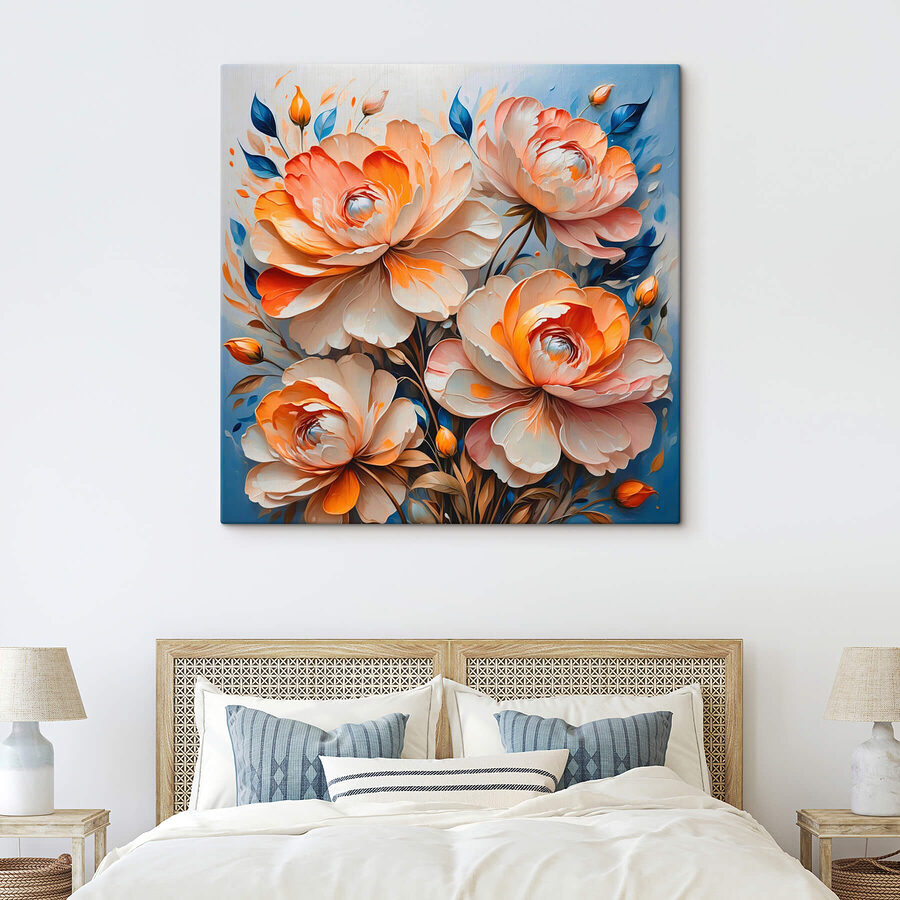 Deze canvasprint van bloemen op een serene blauwe achtergrond is als een verademing voor elke kamer. Stel je voor: levendige bloesems barstensvol kleur, elk bloemblaadje dansend van persoonlijkheid. Het is bijna alsof de lente besloten heeft naar binnen te verhuizen en die heerlijke warmte met zich meebrengt. Stel je voor dat je ‘s ochtends aan je koffie nipt terwijl je naar die bloesems staart – daar word je vast vrolijk van of misschien ga je zelfs wel een beetje dagdromen. Perfect om een gezellig hoekje op te fleuren of een kantoor op te fleuren, dit stuk hangt niet alleen aan de muur maar nodigt ook uit tot gezelligheid. Misschien raak je er wel mee aan de praat. Geloof ons, zo charmant is het.