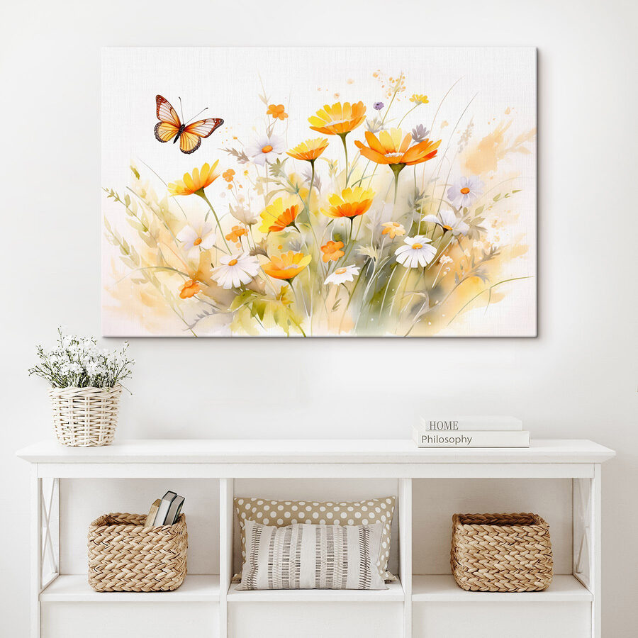 Stel je voor dat je een tuin binnenstapt waar een levendige vlinder rondfladdert en leven brengt in een vrolijk geheel van gele en witte bloemen. Deze canvasprint legt precies dat moment vast en straalt warmte en vreugde uit! Het is als een klein feestje van de natuur aan je muur. Elk bloemblaadje en elke penseelstreek voelt als een zachte omhelzing, perfect om een woonkamer of gezellige ruimte op te fleuren. Eén blik op dit kunstwerk en je voelt je misschien geïnspireerd om een zonnehoed op te zetten en buiten op avontuur te gaan. Of je nu thee drinkt of een boek leest, deze print zet de juiste toon. Een vleugje kleur dat fluistert: “Hé, het leven is mooi!”.
