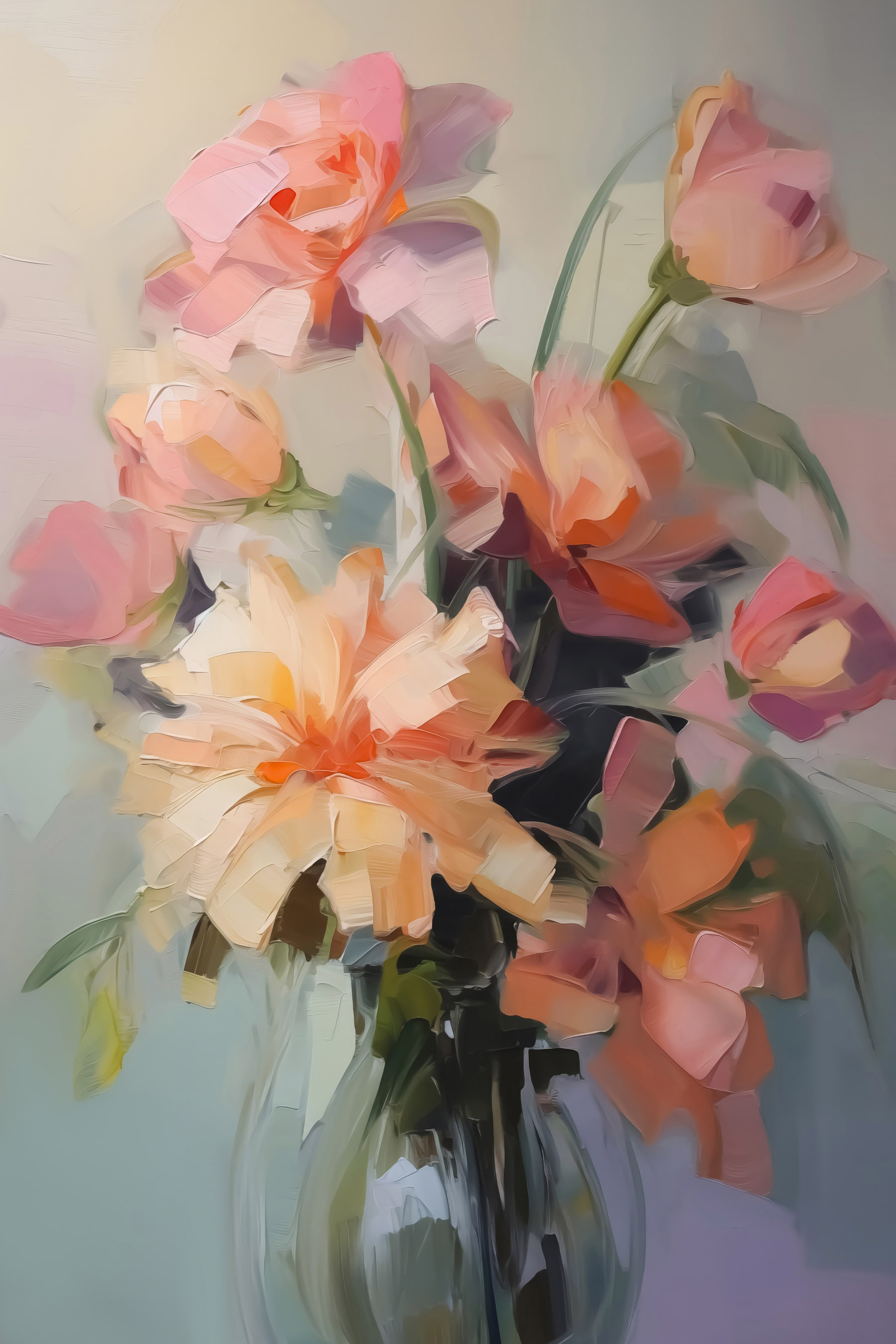 Fleur elke kamer op met deze prachtige canvasprint van bloemen in een vaas. Het is alsof je een kleine tuin in huis haalt, zonder het vuil en de beestjes – alleen pure, kleurrijke schoonheid die niet verwelkt! Stel je voor dat je elke ochtend wakker wordt met deze vrolijke uitbarsting van bloemen. Perfect om een gezellig hoekje te creëren of zelfs als conversatiestarter tijdens een kopje koffie met vrienden. Elk spatje roze en zacht oranje danst op een heerlijke manier en doet denken aan zonnige dagen en een zacht briesje. Perfect voor de bloemenliefhebber of iedereen die een vleugje vrolijkheid in zijn inrichting nodig heeft. Wie zou daar niet om glimlachen?