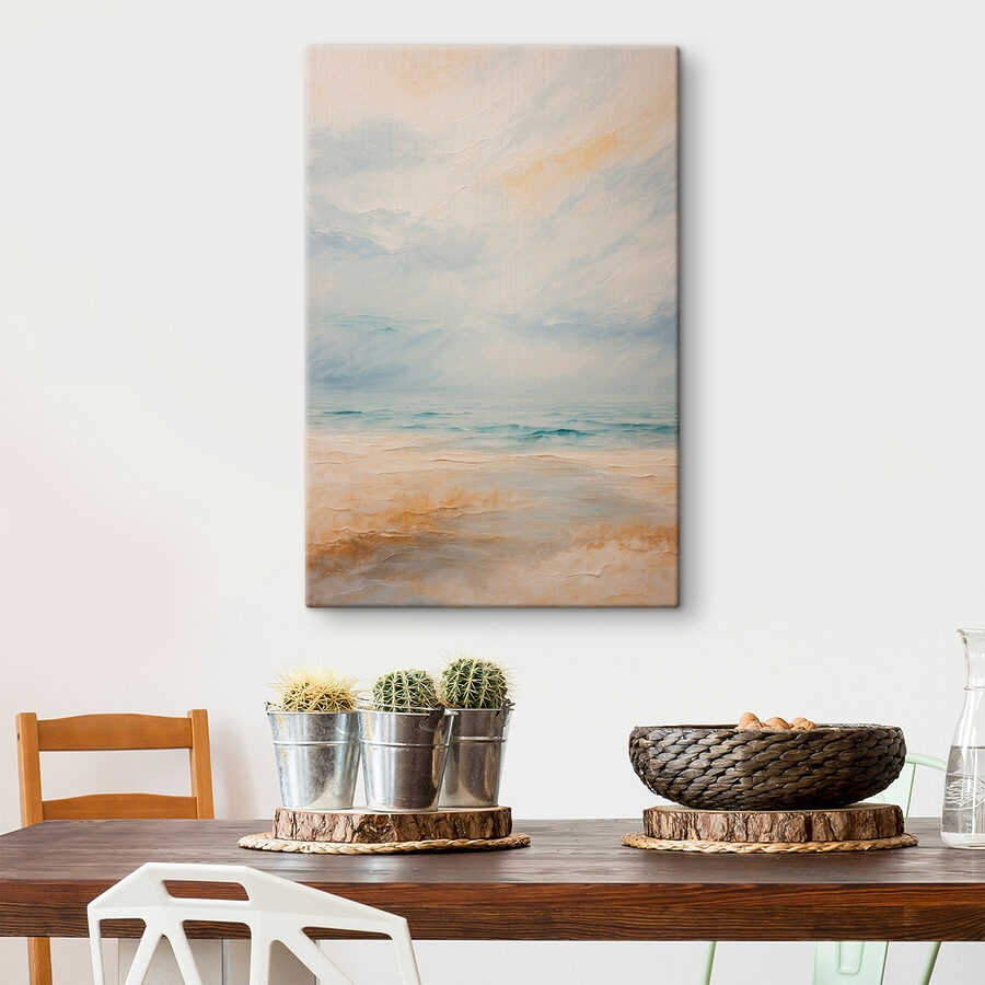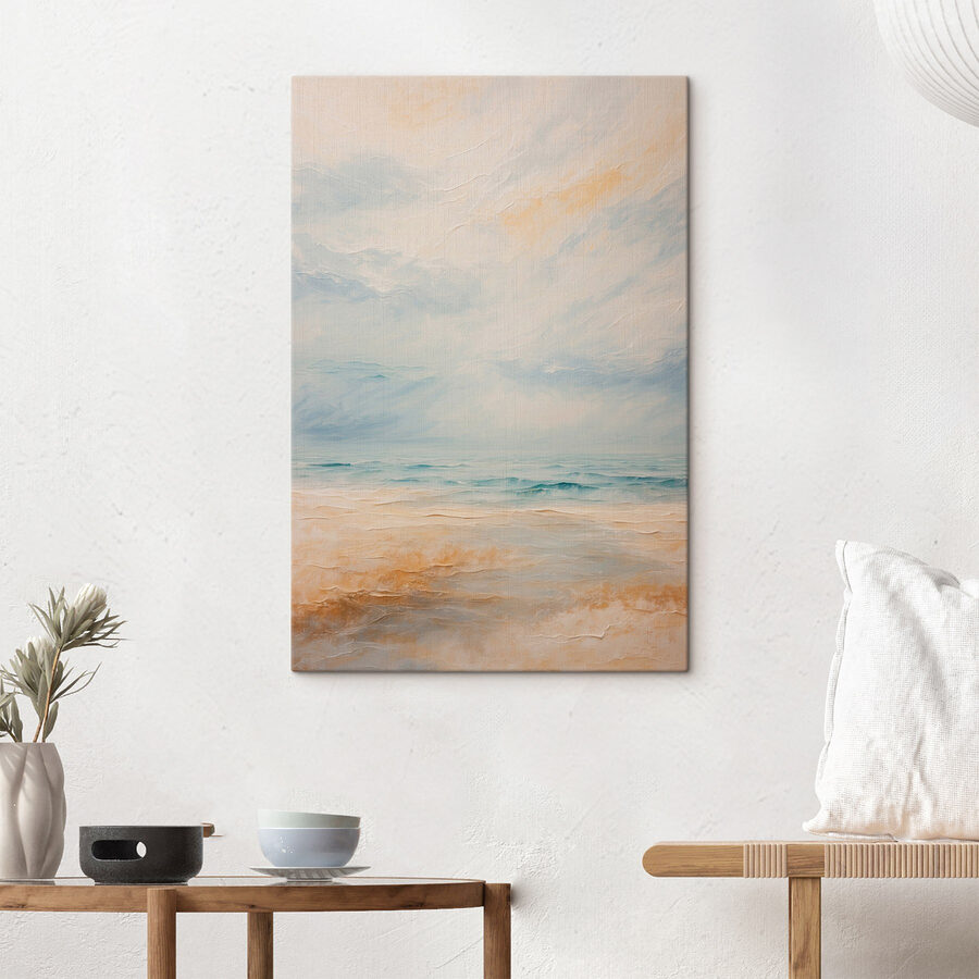 Stel je voor dat je wakker wordt met de zachte tinten van een rustig strand. Deze canvasprint legt dat perfecte moment vast waarop de zon door de wolken breekt en het zand en de branding in dromerige kleuren baadt. Het is alsof je een stukje paradijs aan je muur hebt hangen. Elke blik kan je meevoeren naar de kust, zelfs als je vastzit in een hoogbouw in de stad. Stel je voor dat je van een kopje koffie nipt, de zeewind op je huid voelt, terwijl dit serene kunstwerk je ruimte in een rustige sfeer hult. Het is de perfecte gespreksstarter – of misschien gewoon een goed excuus om weg te dromen! Dus of je nu een gezellig hoekje inricht of je woonkamer opfleurt, dit kunstwerk brengt de schoonheid van de natuur naar binnen, waardoor elke dag aanvoelt als een stranddag.