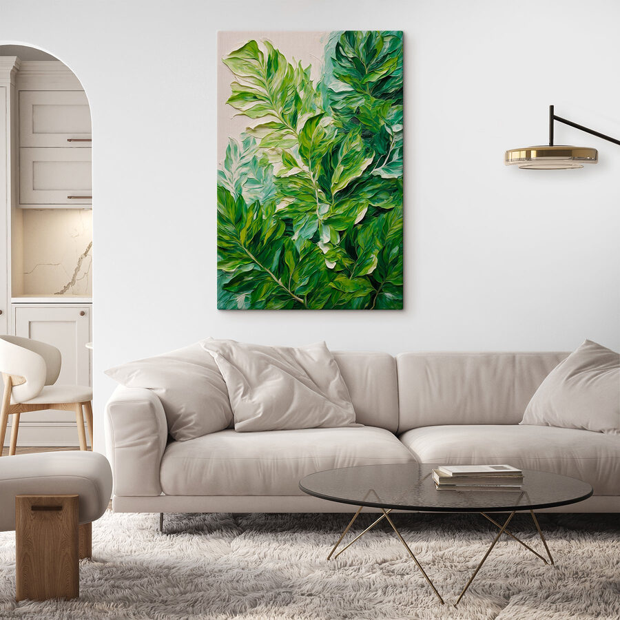 Verander een lege muur in een levendig gespreksonderwerp met deze prachtige canvasprint van bladeren die een ongerept oppervlak sieren. Het is alsof je een stukje natuur in huis haalt, maar dan zonder de insecten – gelukkig maar! Het rijke groen steekt af tegen de zachte achtergrond en voegt een frisse sfeer toe die zowel rustgevend als verkwikkend is. Stel je voor dat je lekker knus met een goed boek zit, terwijl het zonlicht naar binnen stroomt en deze weelderige bladeren je ruimte die perfecte botanische touch geven. Geweldig voor elke kamer, of het nu een vrolijke keuken is of een relaxte woonkamer. Het is kunst uit de natuur, vereenvoudigd en klaar om je dag op te fleuren!