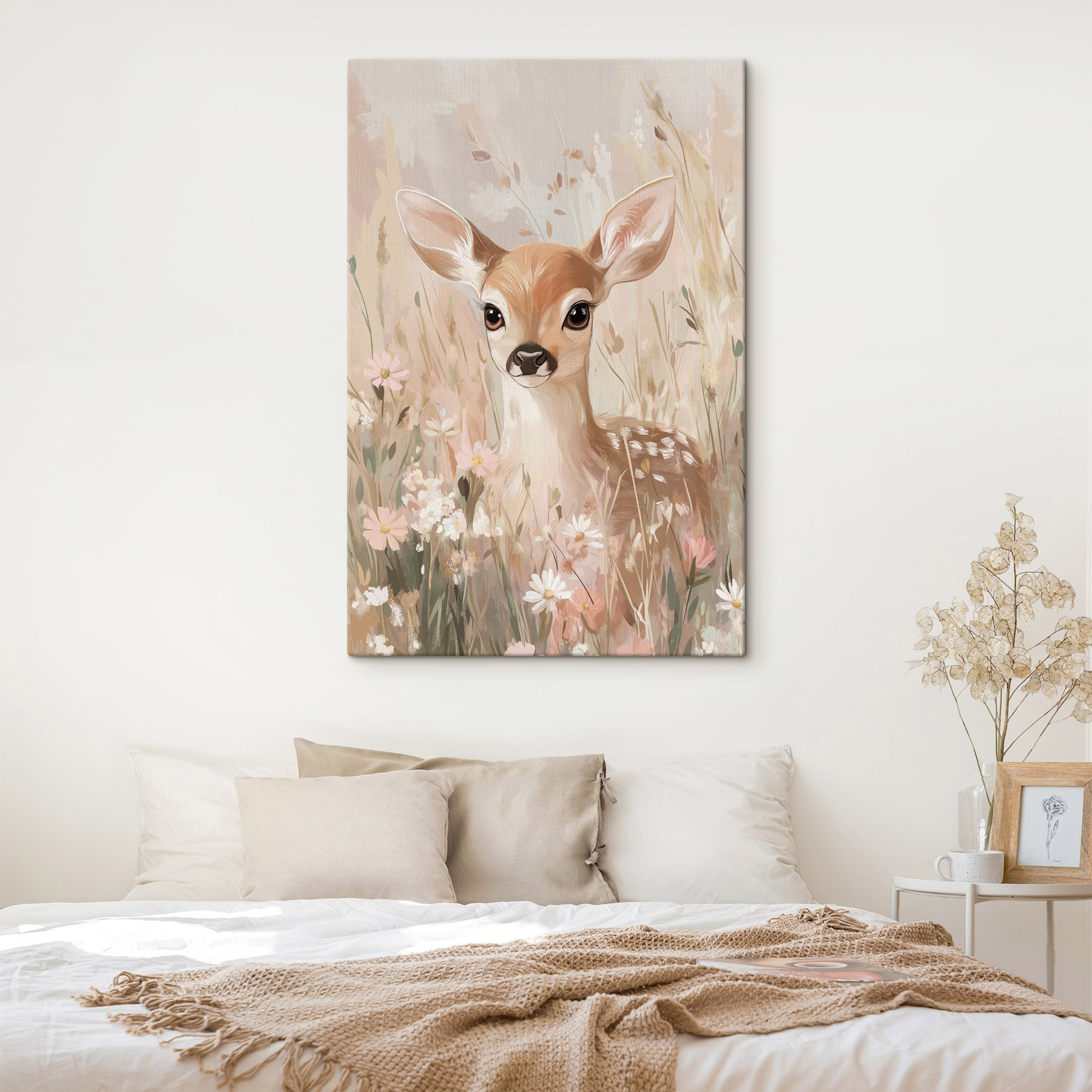 Bring a touch of the serene outdoors into your space with this charming canvas print. Picture this: a gentle deer, just peeking through a field of delicate flowers, seems to whisper secrets of nature’s quiet beauty. It’s like a soft hug for any room, giving off vibes of cozy warmth and tranquility. Imagine sipping your morning coffee, and this little one is there, adding a sprinkle of whimsy to your day. Perfect for cozy corners or brightening up your living space, it’s a delightful reminder to take a breath and appreciate life’s simple wonders. Plus, who wouldn’t smile at that adorable face?